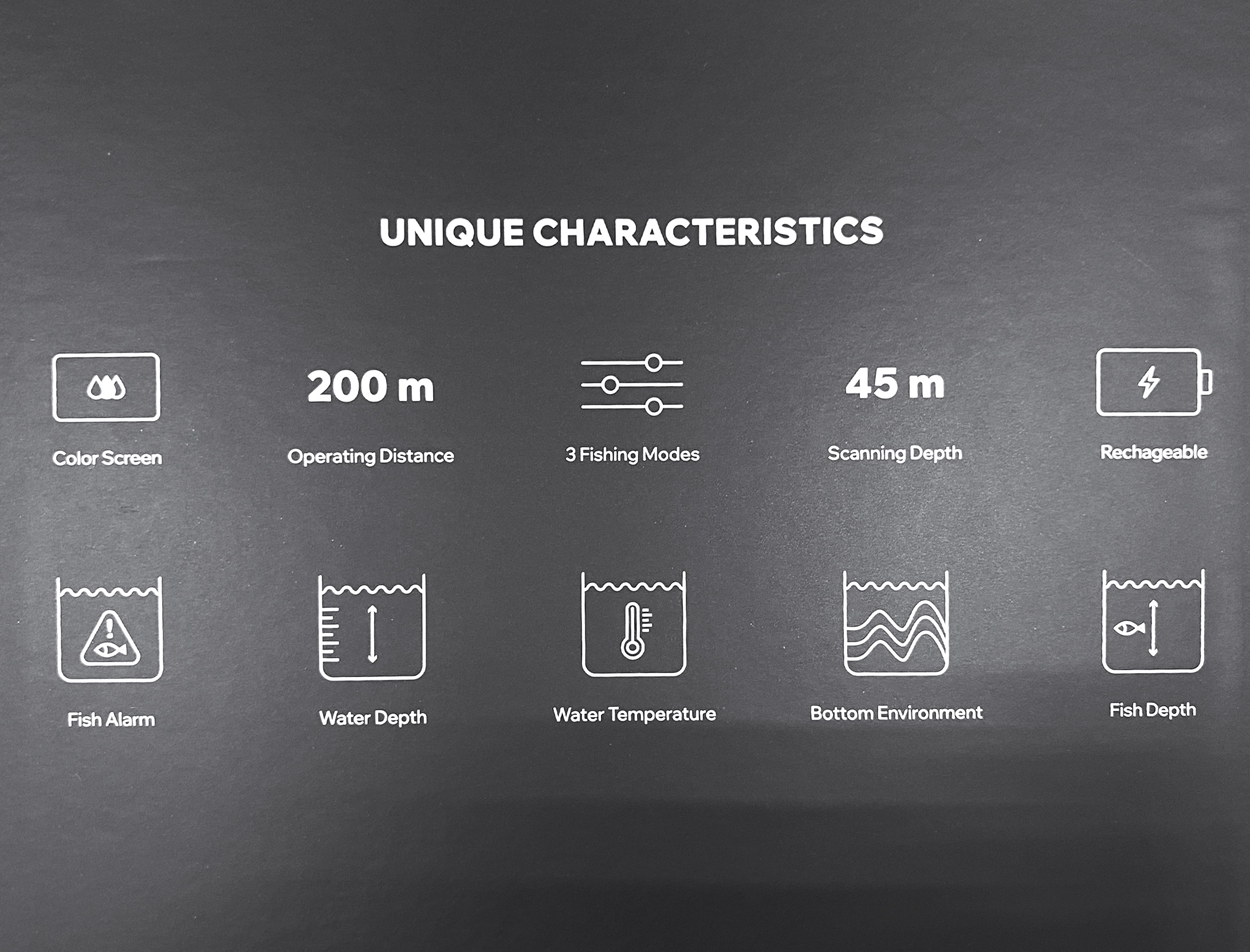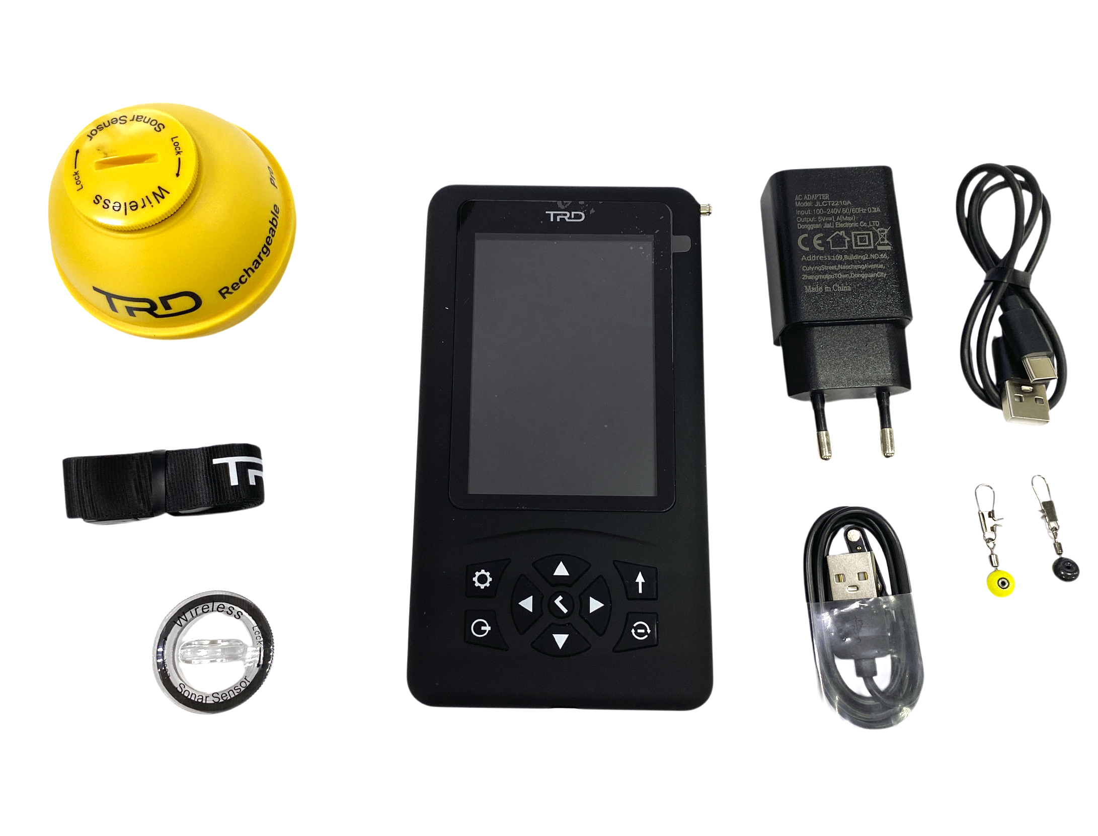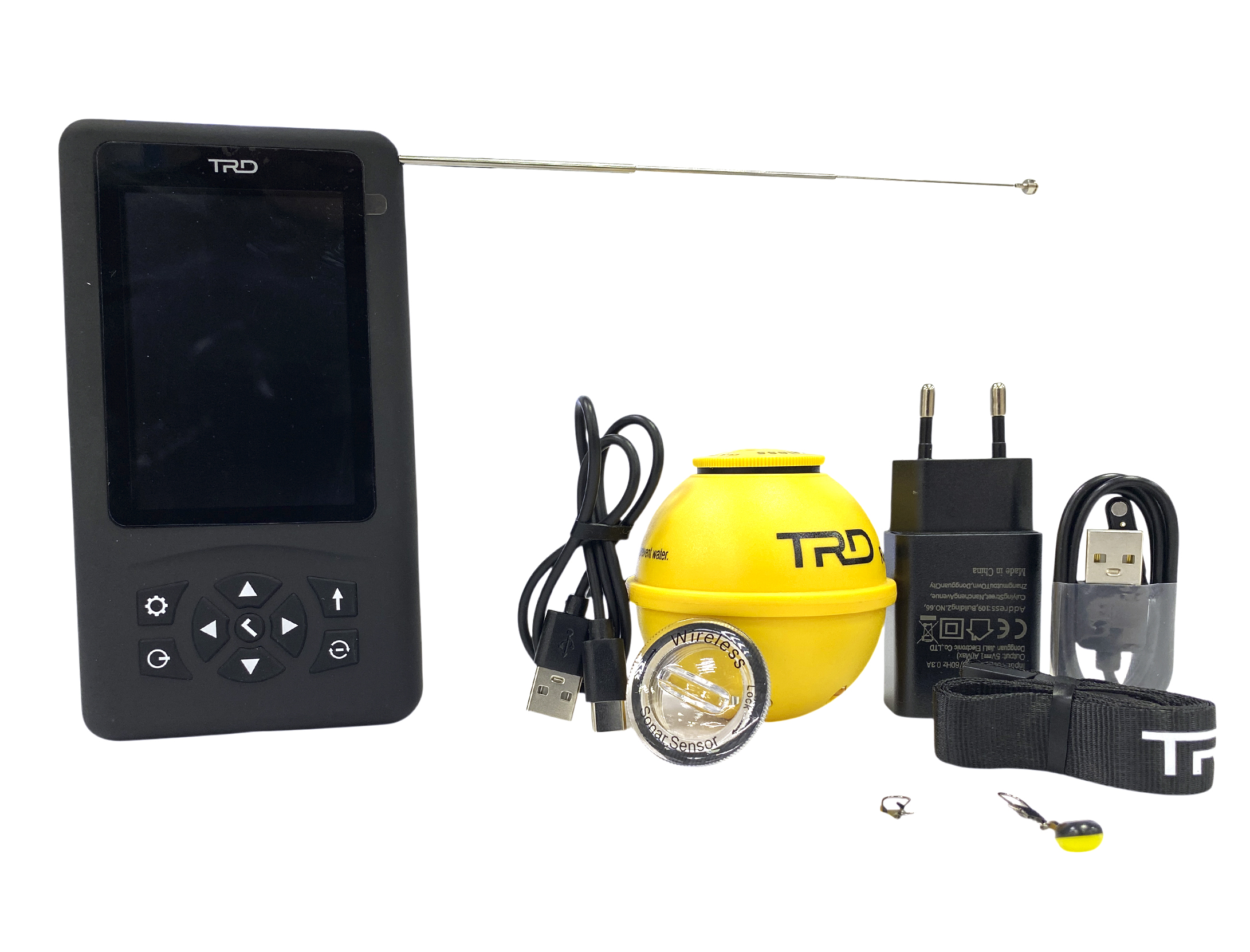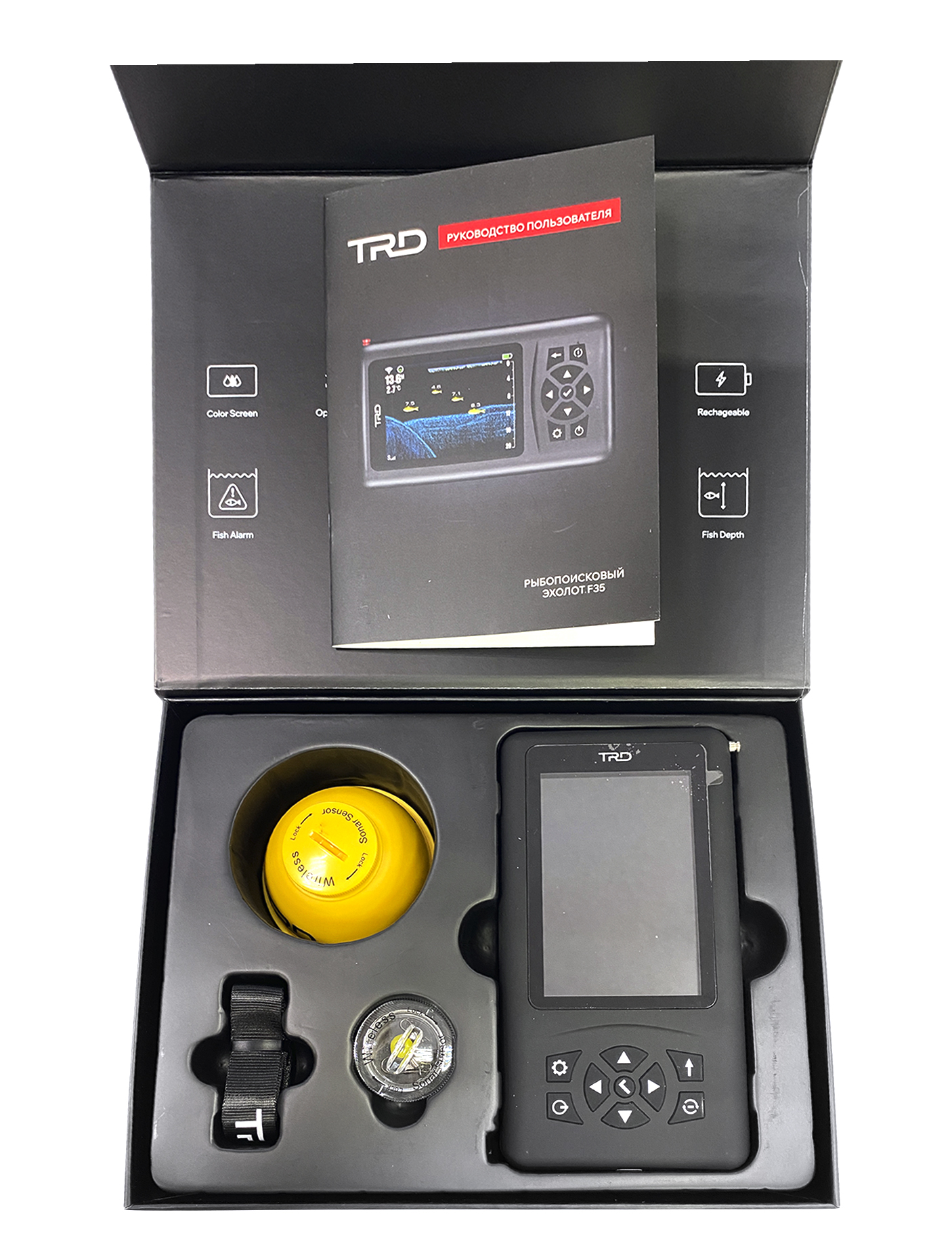 | Комплектация: | приёмник с цветным дисплеем — 1 шт.; беспроводной трансдюсер — 1 шт.; заглушка для ночной ловли — 1 шт.; ремешок — 1 шт.; USB-кабель для зарядки — 1 шт.; коннектор для лески — 2 шт. |