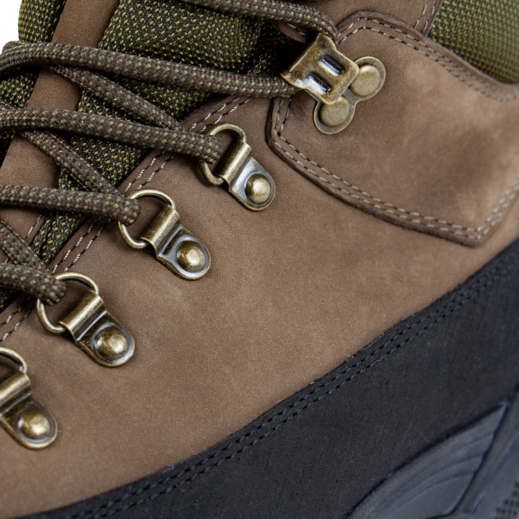 Язычок соединен с верхом с обеих сторон, что предотвращает попадание стороннего мусора, влаги и снега в обувь. Крой ботинка с круговым дополнительным усилением из полиуретана увеличивает долговечность и защищает от травм голеностоп. Исполнение двойных швов внахлёст позволит избежать разрывов. Кольца и крючки из нержавеющей стали защищают кожу от протирания шнурками.