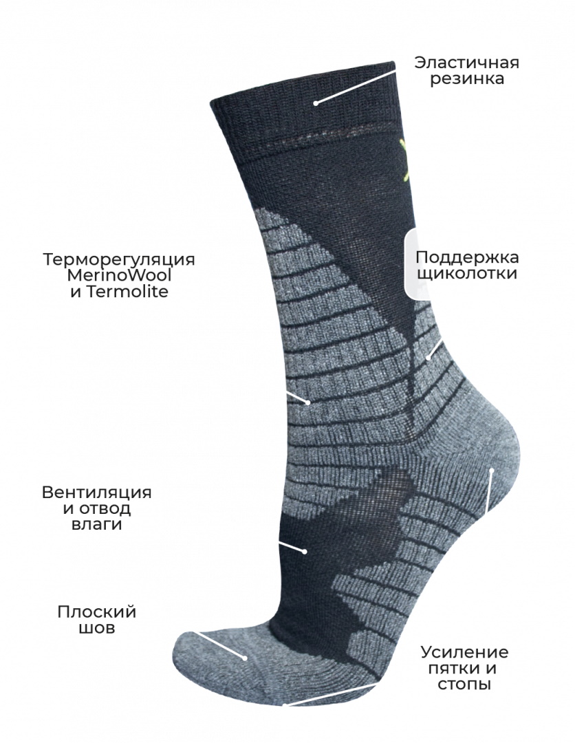 Высокие треккинговые носки для использования в осенне-зимний период. Сочетание теплой и износостойкой мериносовойMerino wool - представляет собой тонко извитую и мягкую шерсть со скобами (длины волокон), которые обычно составляют 65-100 мм (2,5-4 дюйма) и диаметром менее 24 микрон.Подробнее шерсти и материала ThermoliteThermolite