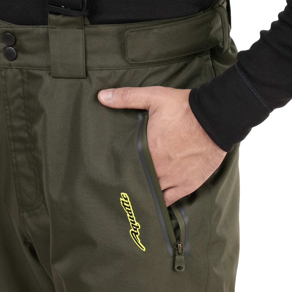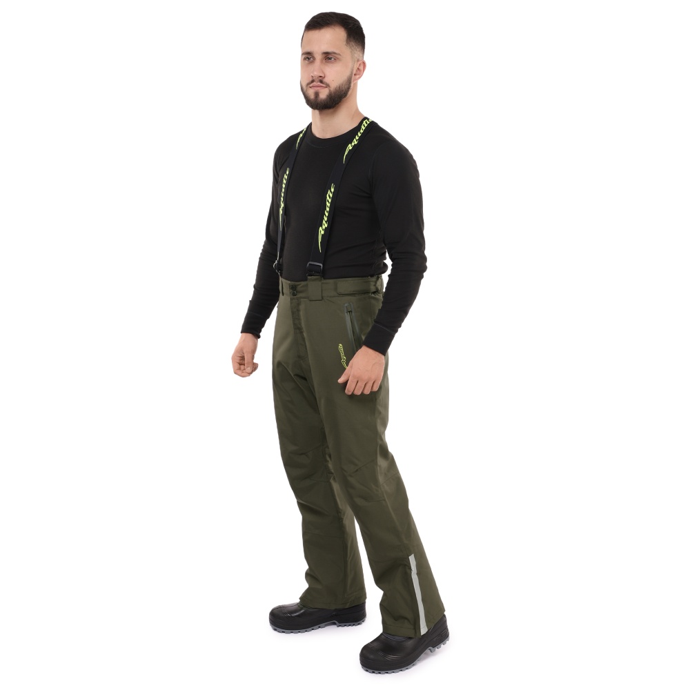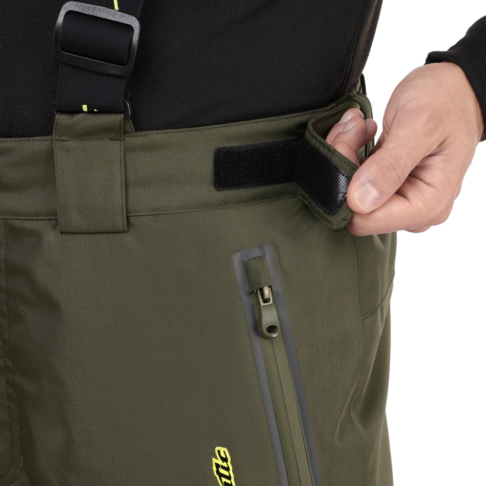 Брюки имеют два кармана с влагозащитными молниями. Высокий пояс защищает поясницу при наклонах и длительном сидении. На пояс прикреплены съемные подтяжки с регулировкой длинны. На брюках есть боковые молнии снизу, а юбка на резинке препятствуют попаданию ветра, снега внутрь.
