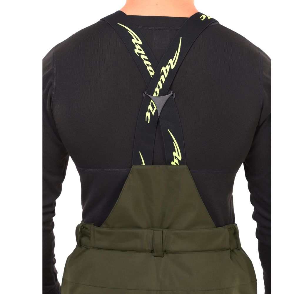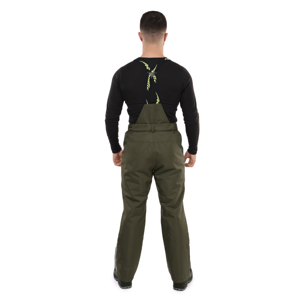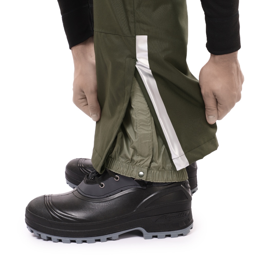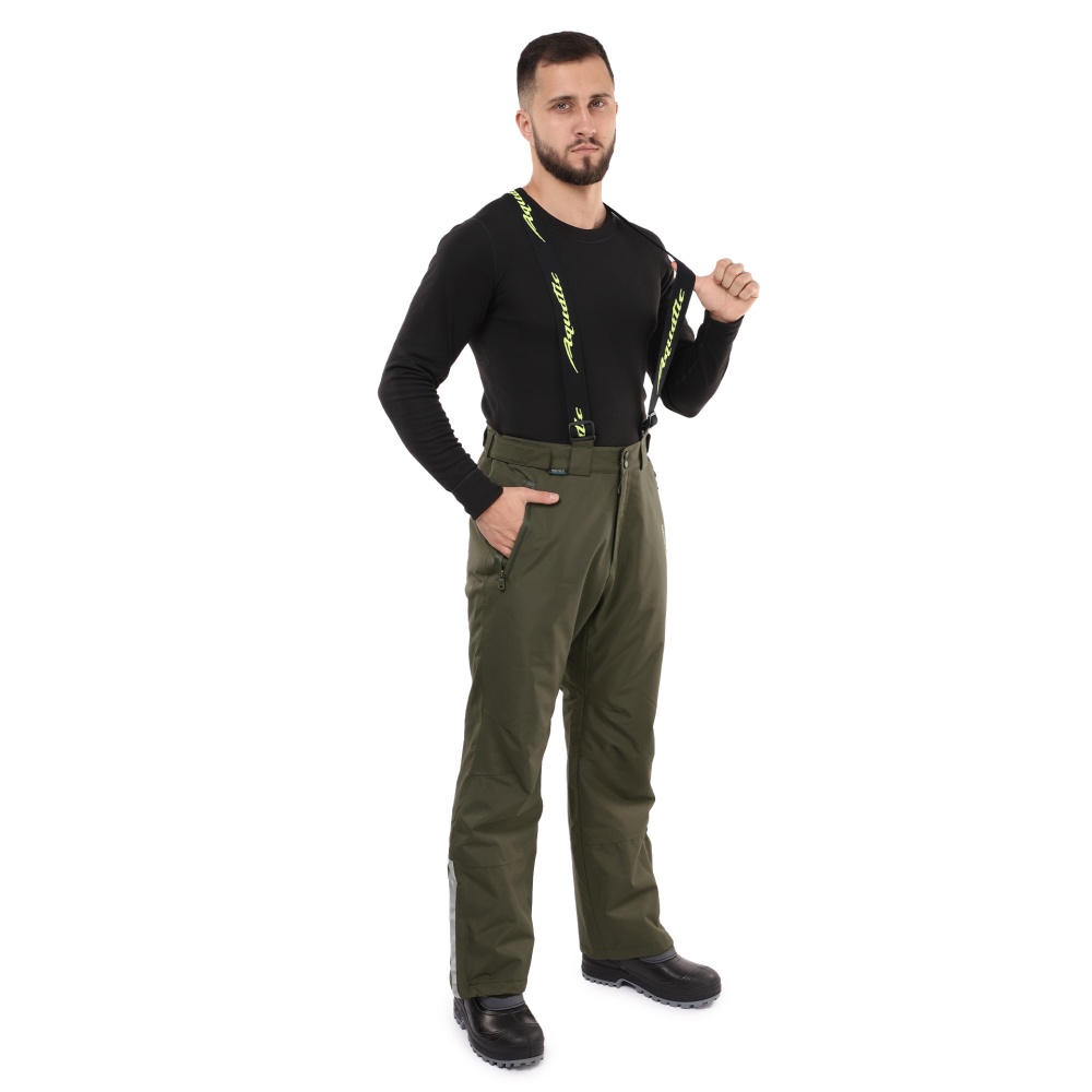 Брюки имеют два кармана с влагозащитными молниями. Высокий пояс защищает поясницу при наклонах и длительном сидении. На пояс прикреплены съемные подтяжки с регулировкой длинны. На брюках есть боковые молнии снизу, а юбка на резинке препятствуют попаданию ветра, снега внутрь.