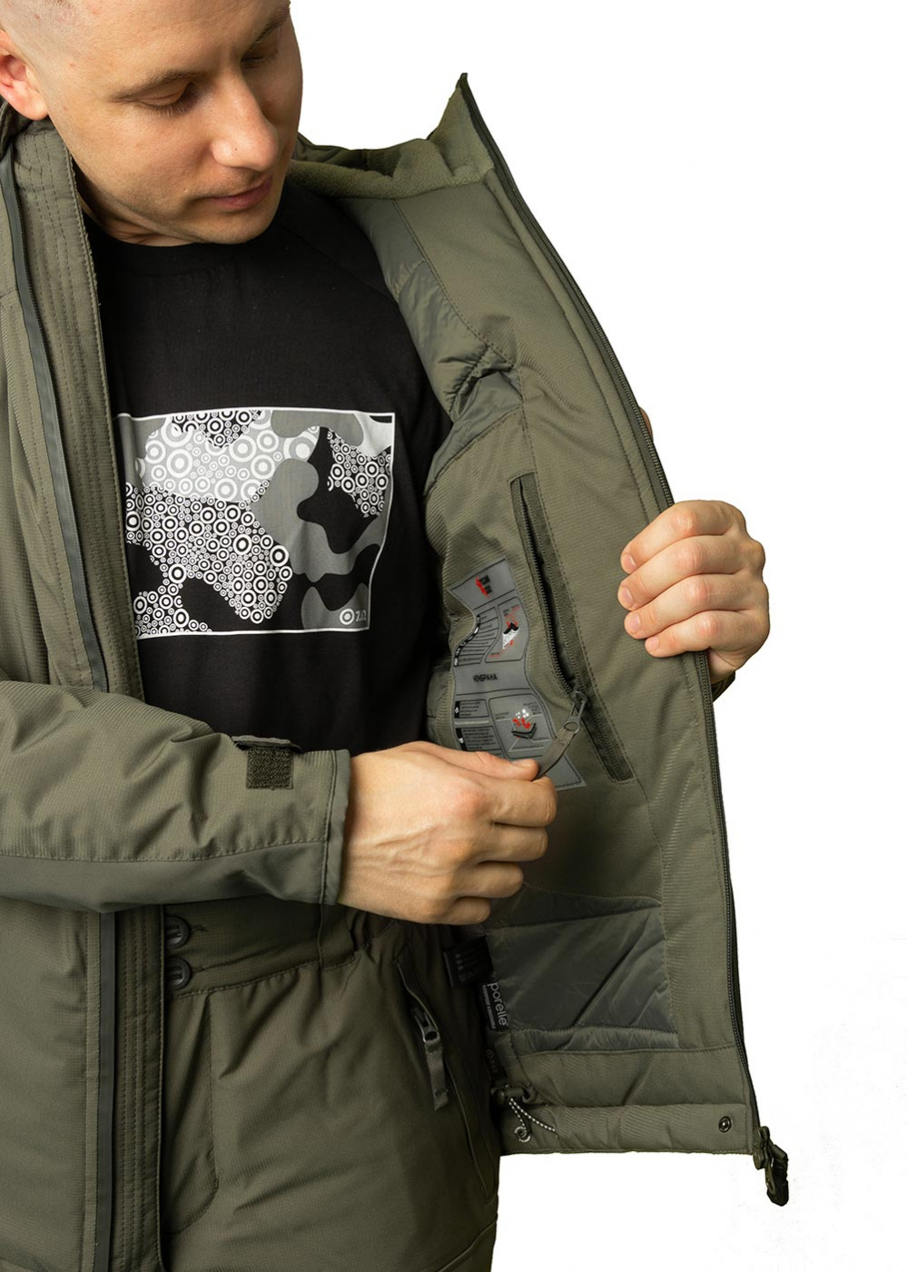 Для простоты ухода ткань обработана тефлономTeflon - это специальная отделка фирмы DuPont, которая обеспечивает тканям отличные водоотталкивающие и пятнозащитные свойства, а также защиту от брызг и грязи.Подробнее. В костюме используется инновационный утеплитель Atmo BrizAtmo Briz - высокопрочный и износостойкий утеплитель, отлично защищающий от сильных порывов ветра, влаги и осадков.Подробнее с высокими показателями теплосбережения. В костюме предусмотрена вентиляция для терморегуляции.