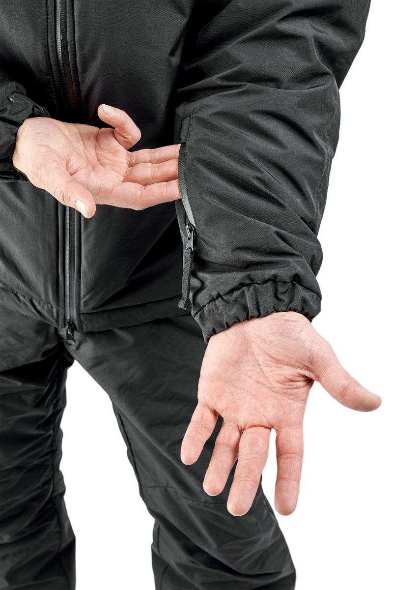 Костюм также оснащен влагозащитными молниями и функциональными глубокими карманами, позволяющими сохранить в сохранности ценные вещи.