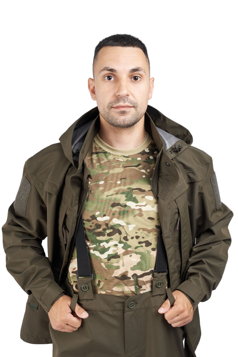 Демисезонный тактический костюм состоит из куртки и брюк для защиты от непогоды в весенне-осенний период. Одевается поверх основной одежды. Куртку и брюки можно использовать как самостоятельное изделие.