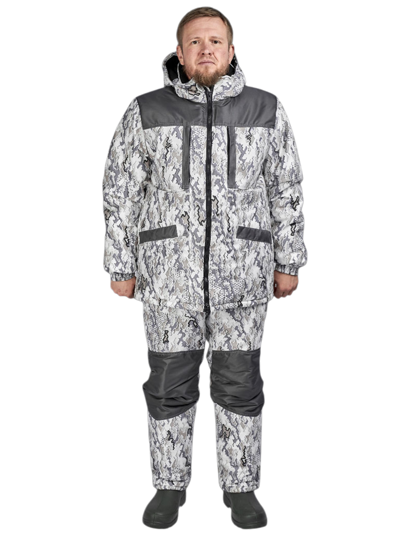 Костюм состоит из куртки и полукомбинезона, что обеспечивает полную защиту от холода и ветра. Куртка оснащена удобными карманами для хранения необходимых мелочей, а полукомбинезон обеспечивает свободу движений и комфорт при активных действиях.
