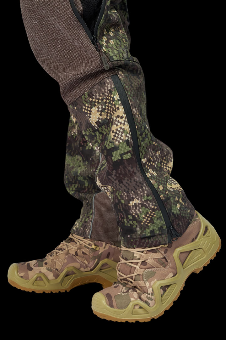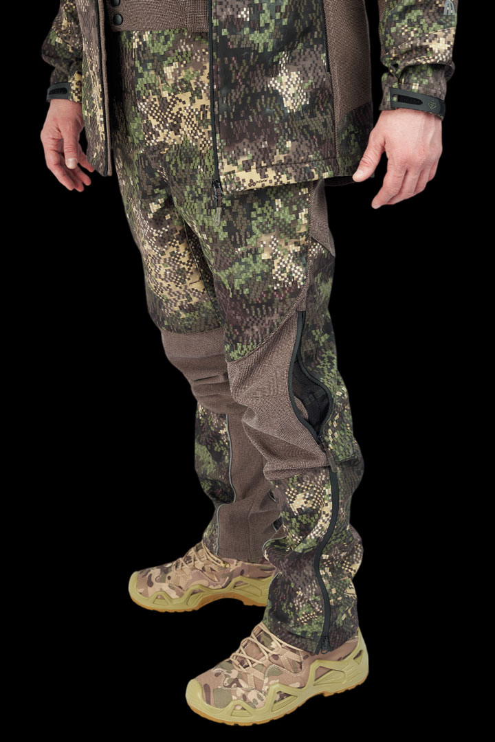 У брюк также имеются карманы спереди, они с наклонным входом для рук, а с задней части еще один карман, и каждый карман выполнен на влагозащитной молнии. На боковых швах брюк в области колен имеются застежки с вентиляцией для обеспечения притока воздуха. Благодаря этому при высоких активностях излишний конденсат выйдет наружу. Молния по низу брюк не только для удобного надевания массивной обуви или высоких сапог, но она также увеличивает объем брюк для комфорта.