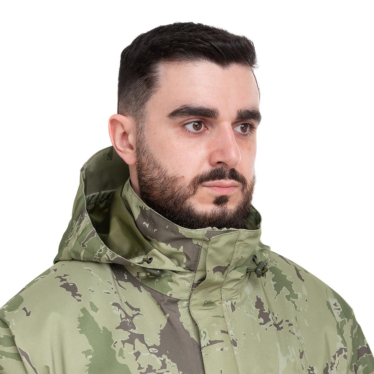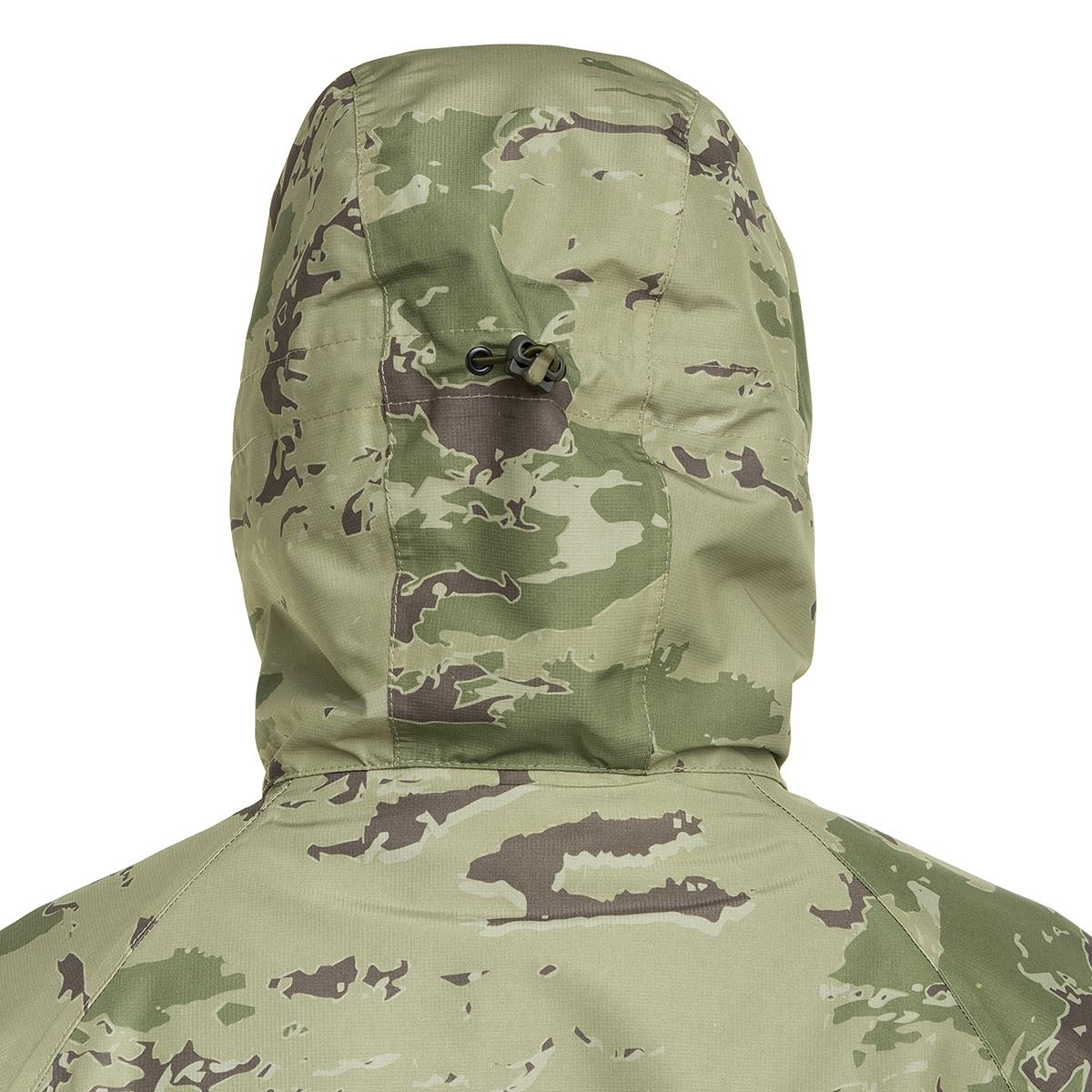 - Высокий воротник-стойка куртки плавно переходит в регулируемый резинкой и фиксаторами капюшон, надежно защищая шею от влаги и ветра;