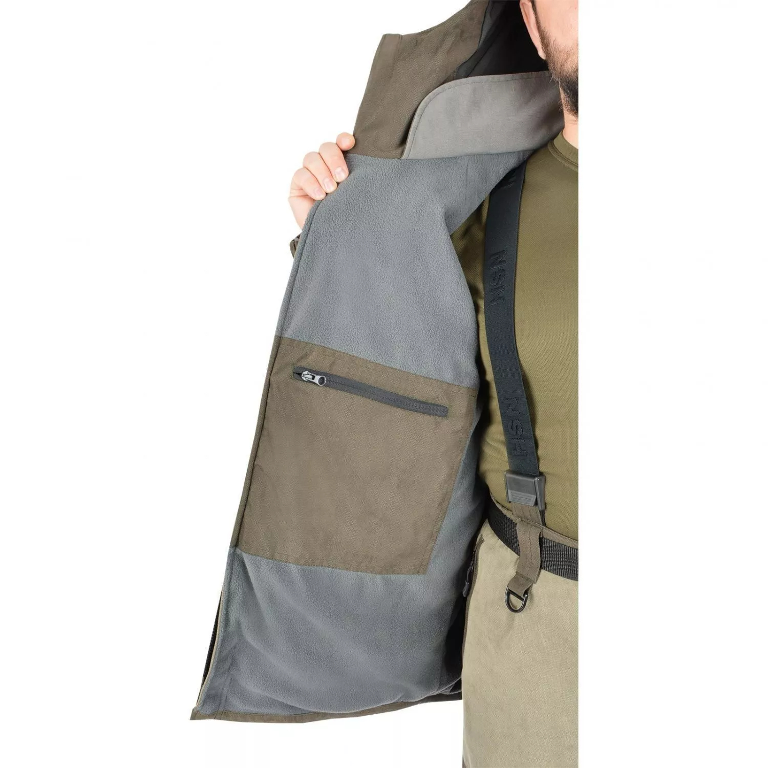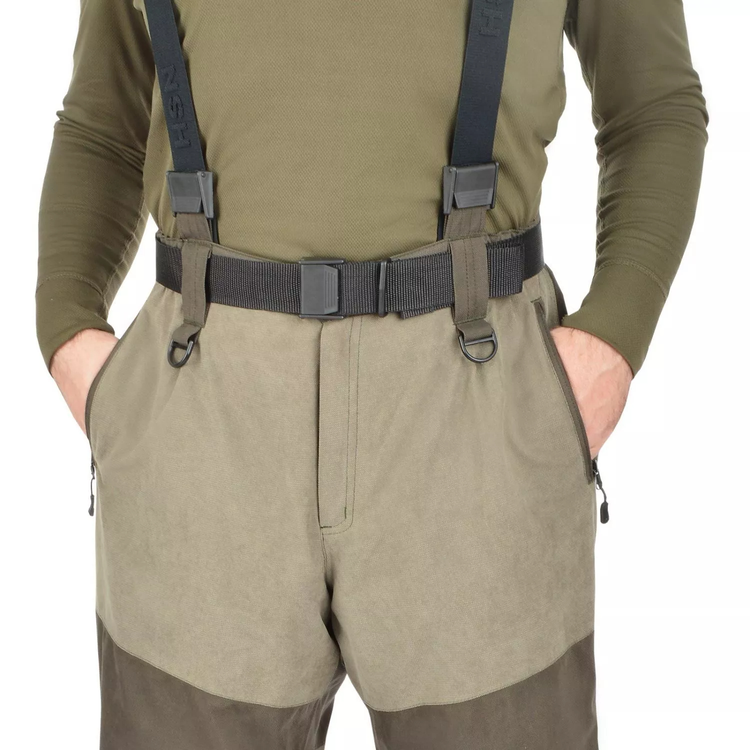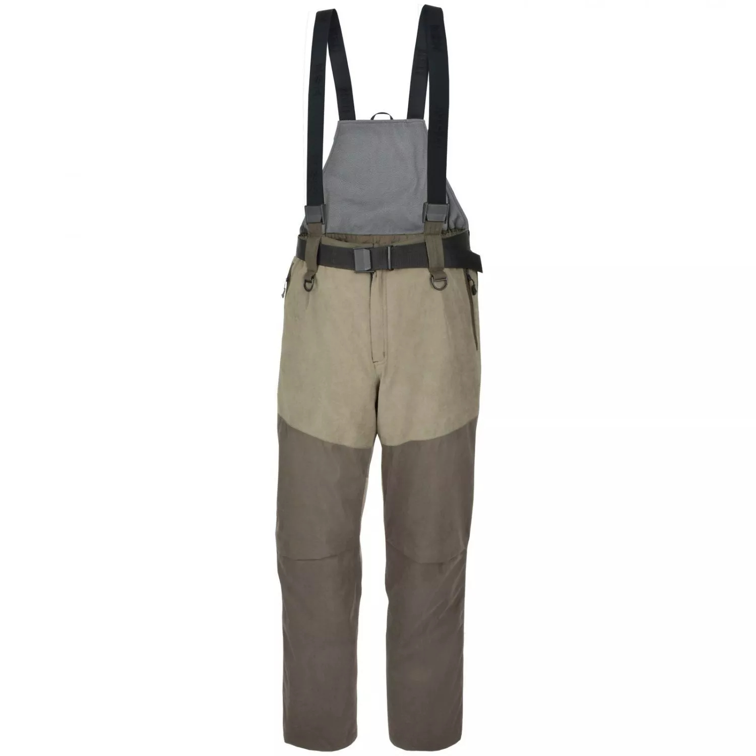 Полукомбинезон с высокой спинкой и поясным ремнем обеспечивает дополнительную защиту от продувания. Длина полукомбинезона регулируется эластичными помочами. Поясной ремень изготовлен из прочной нейлоновойNylon - представляет собой гладкий, легкий, приятный на ощупь материал. Внешне напоминает натуральный шелк, но стоимость его гораздо ниже.Подробнее стропы, позволяя подвешивать охотничьи принадлежности. Также на полукомбинезоне есть полукольца для подвешивания охотничьих аксессуаров.