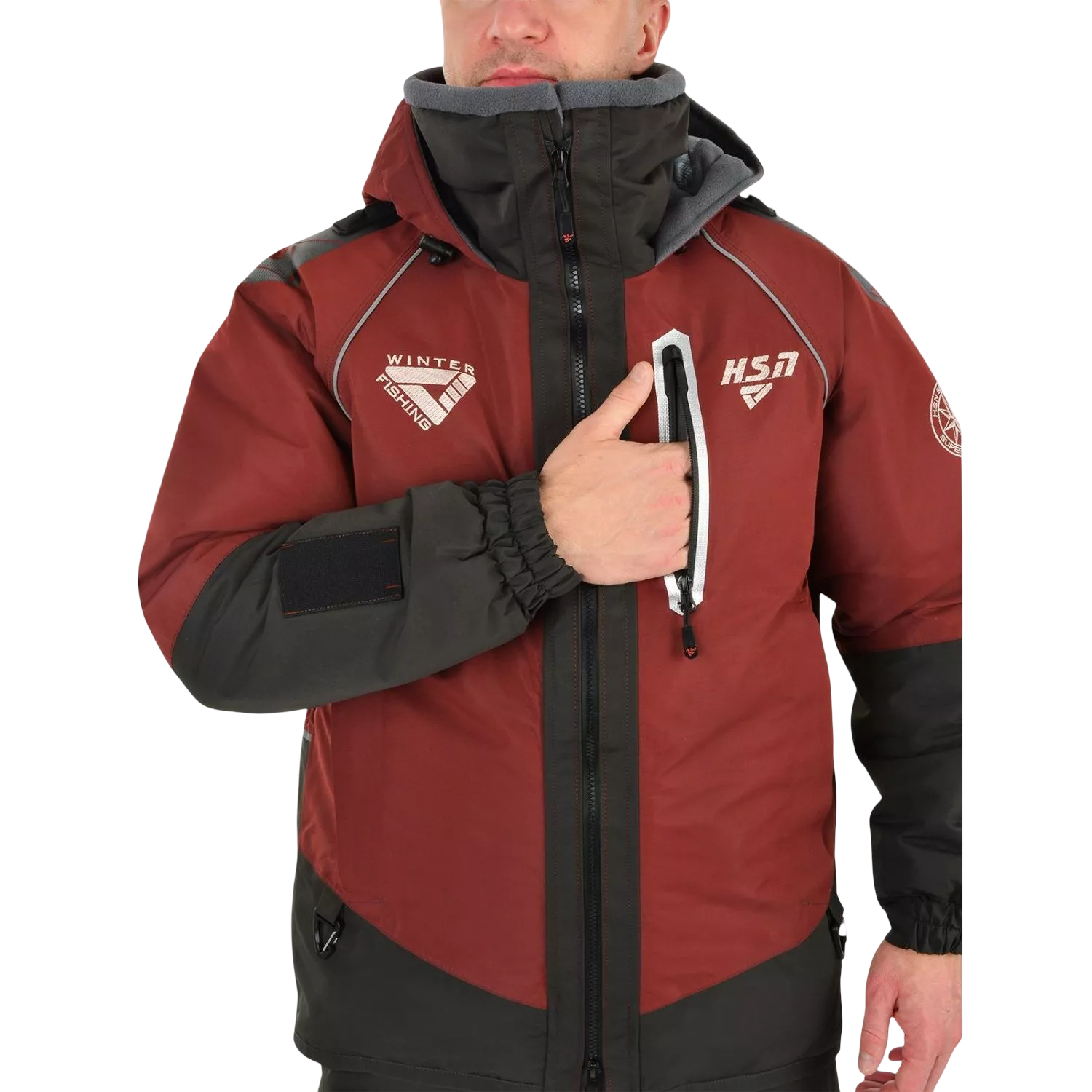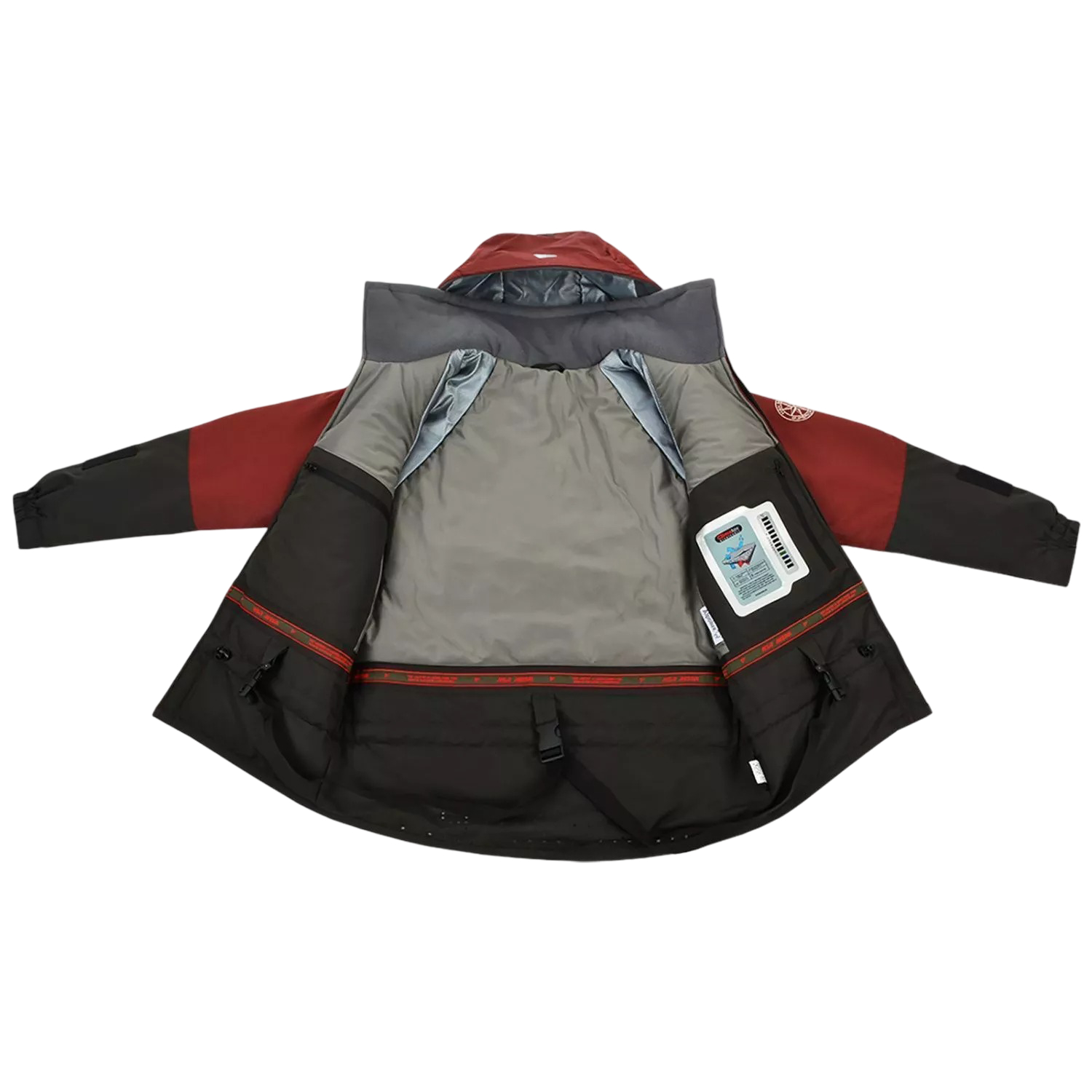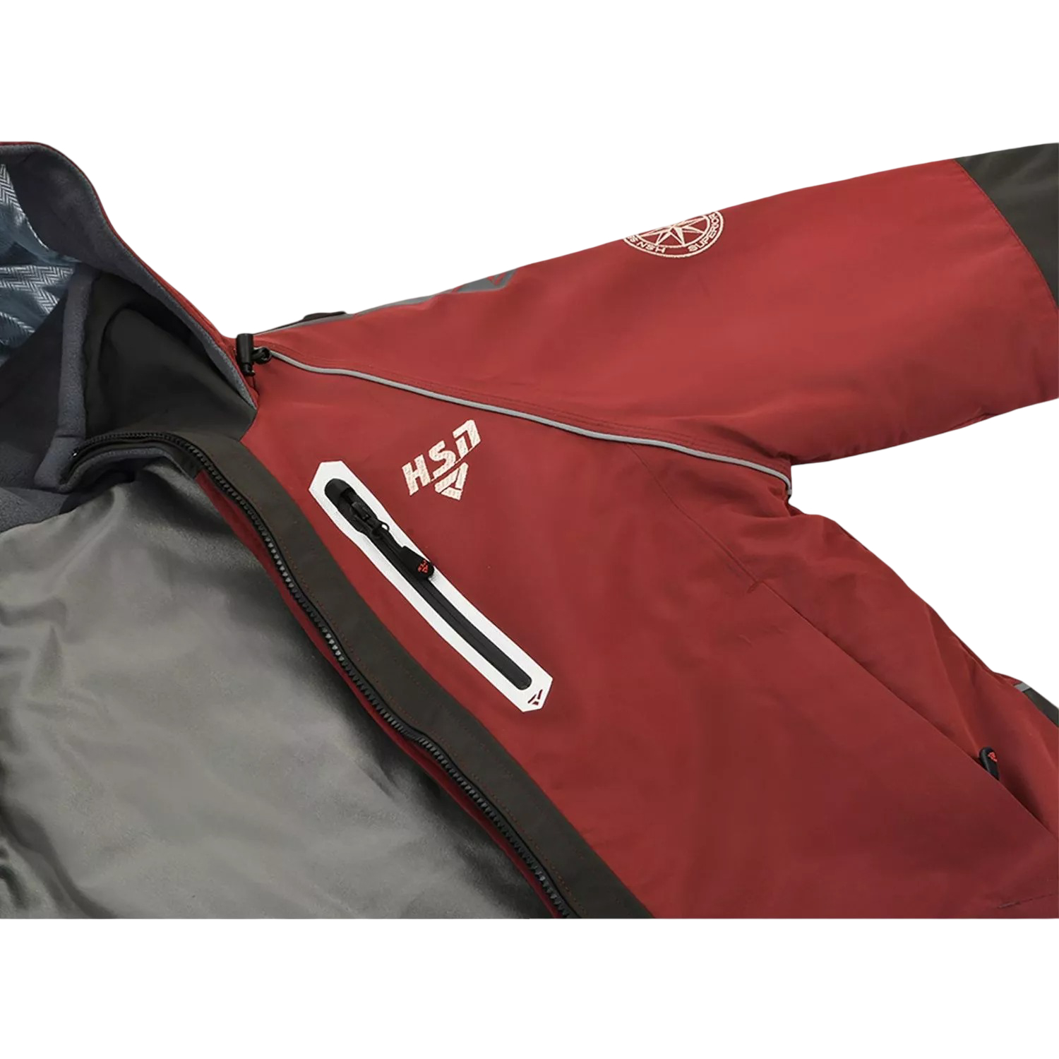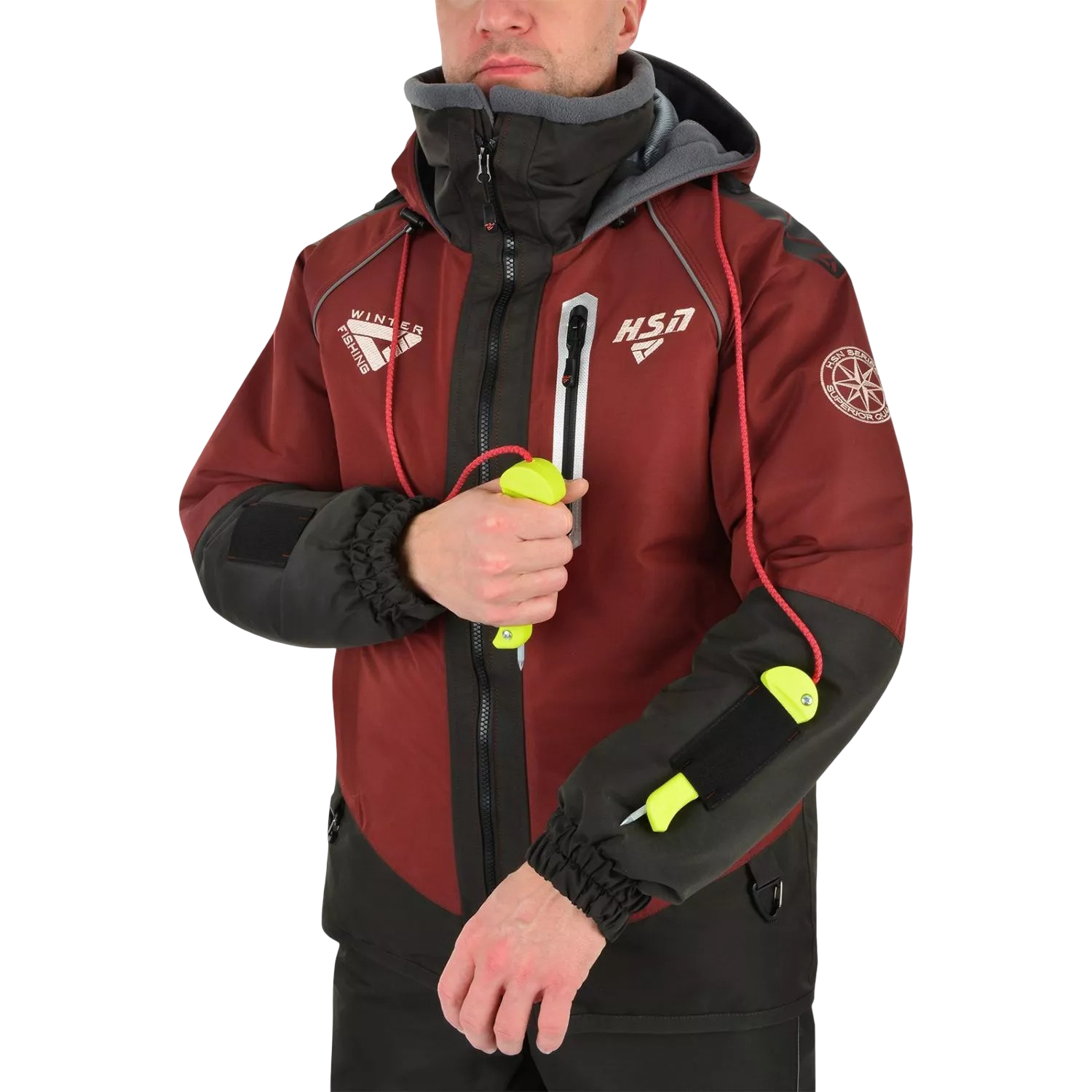 Куртка оснащена высоким воротником для защиты от ветра и глубоким капюшоном с жестким ветрозащитным козырьком. Утепленные карманы на куртке предназначены для размещения необходимого снаряжения и согрева рук. Специальные крепления для спасалок (идут в комплекте) и перфорация ткани на спинке и рукавах облегчают выход из воды при случайном падении.