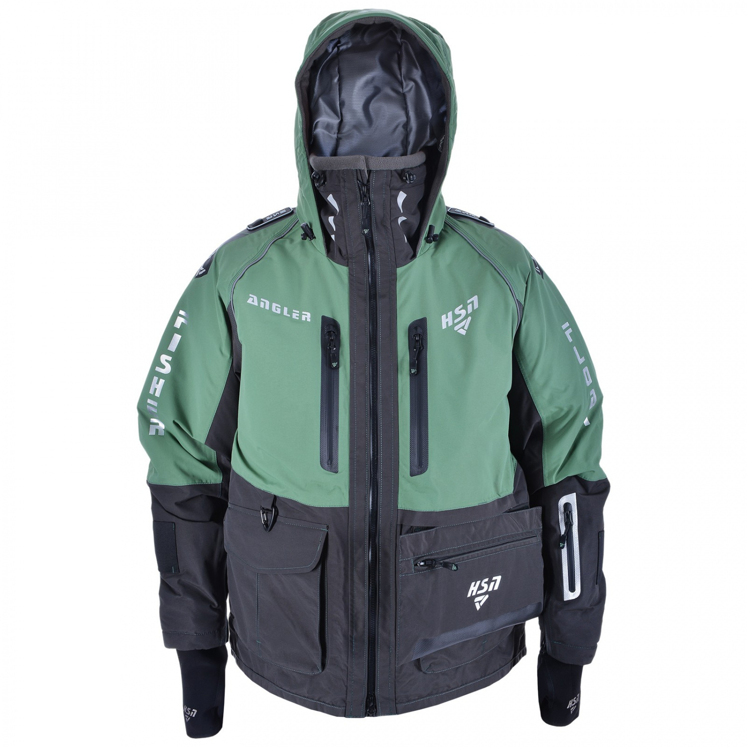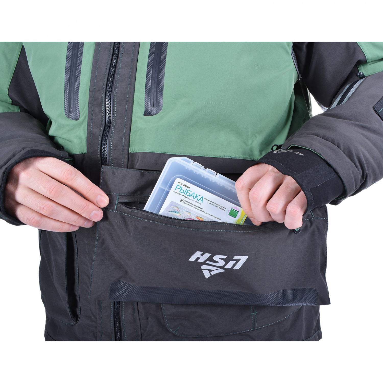 Высокий воротник куртки надёжно защищает от ветра, а удобный капюшон с жёстким козырьком эффективно противостоит ветру и влаге. Глубокие утепленные карманы предназначены для хранения необходимого инвентаря и согрева рук. Дополнительный съёмный карман с пластиковой коробкой для приманок (размером 22*12*2 см) крепится на молнии.