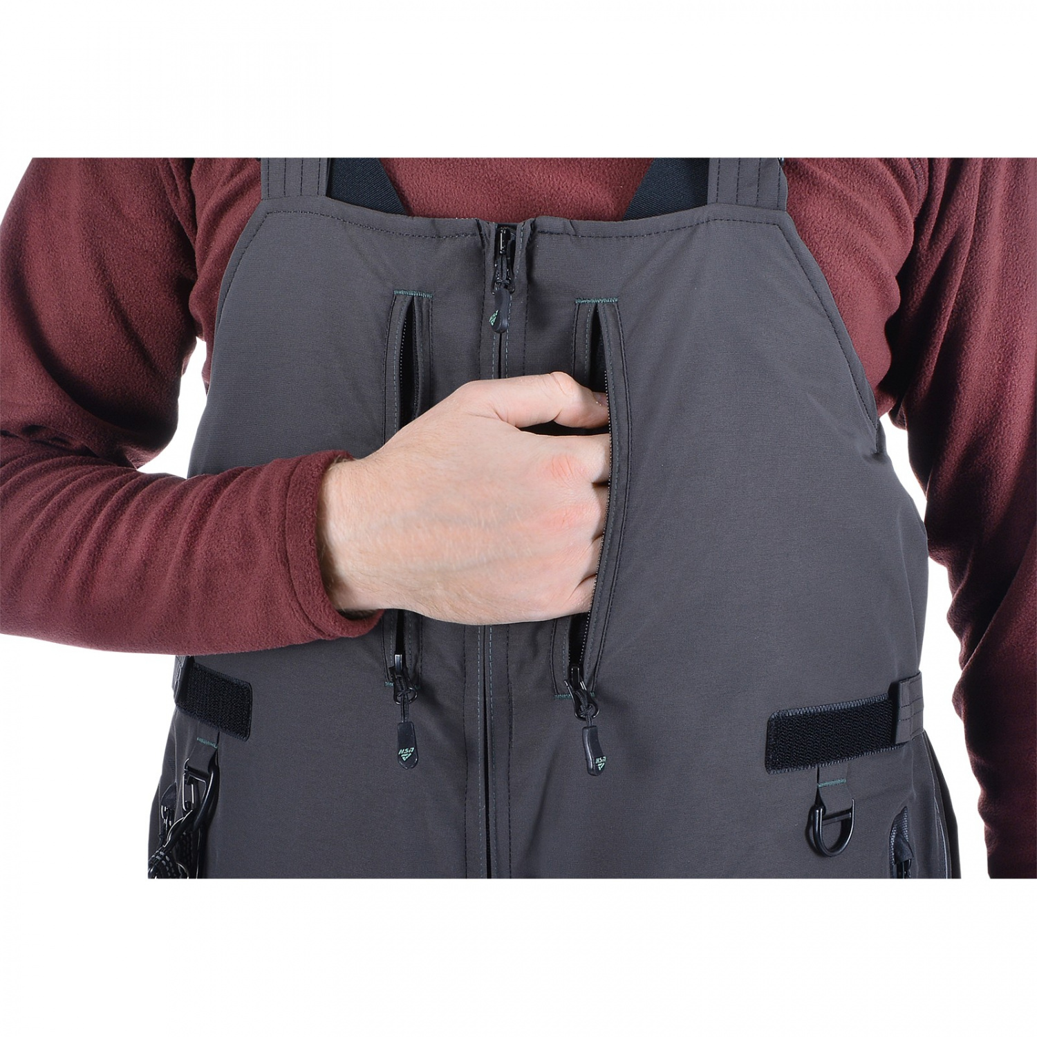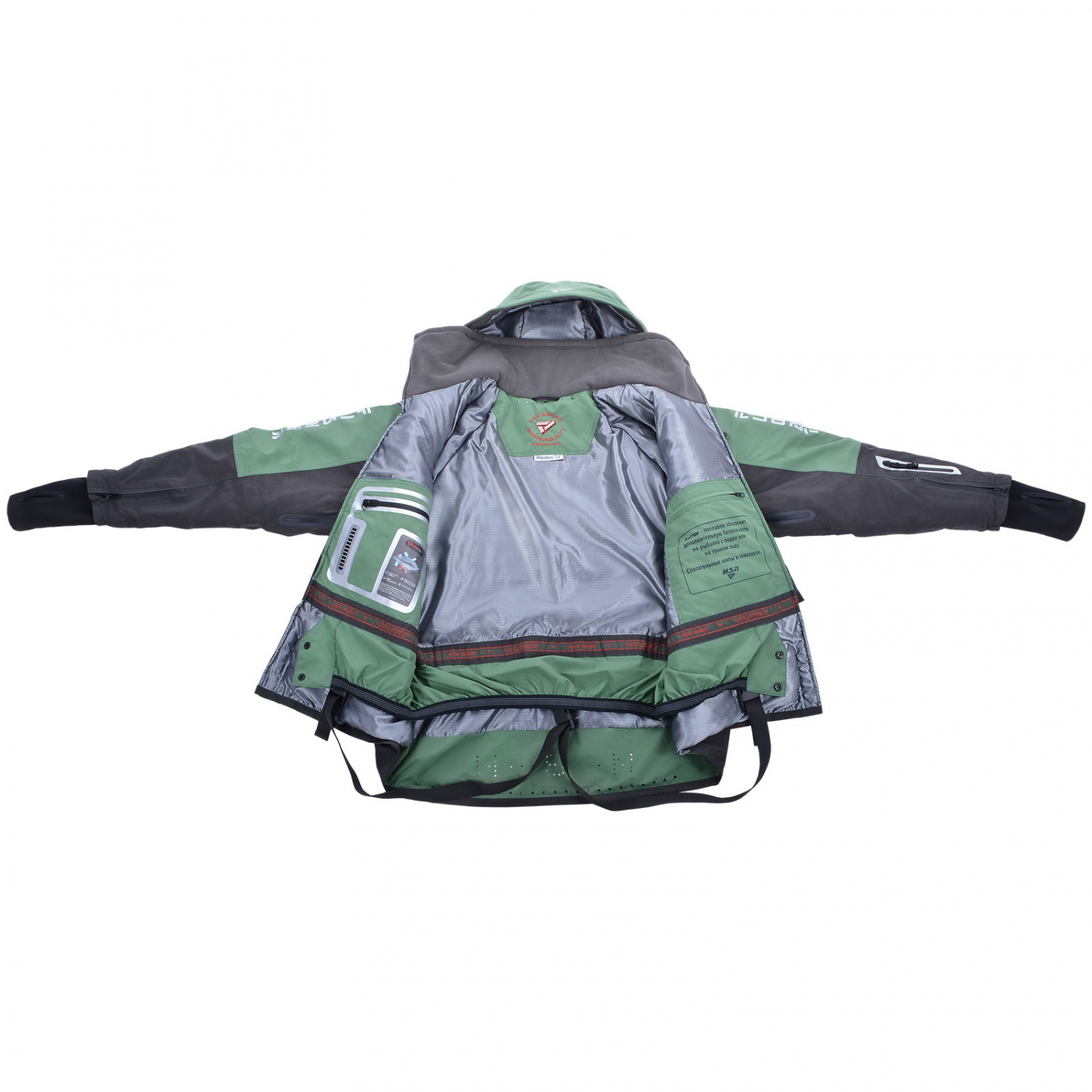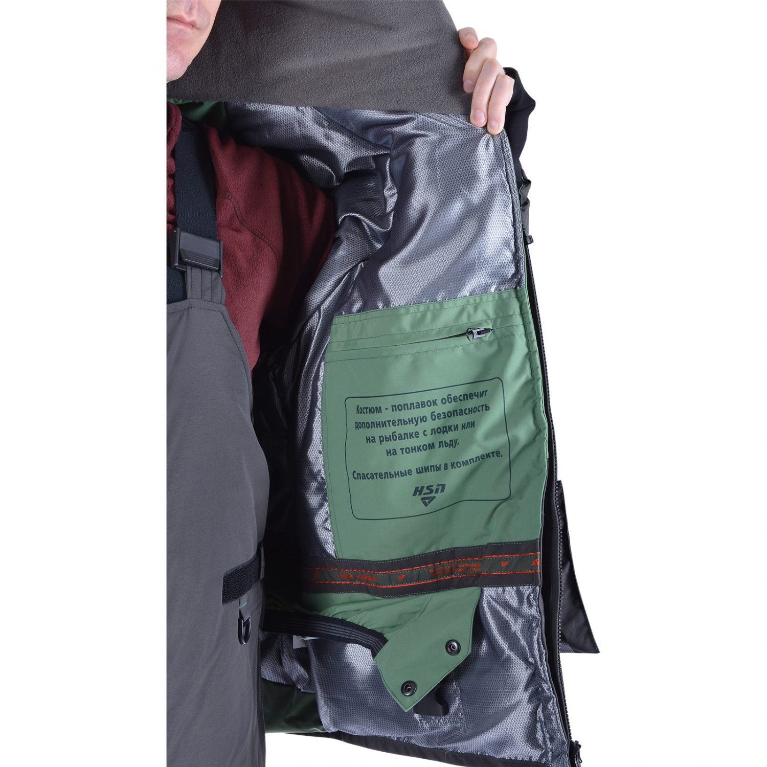 Дизайн костюма и его плавучие свойства тщательно продуманы для обеспечения максимальной безопасности во время рыбалки и активного отдыха на воде или тонком льду.