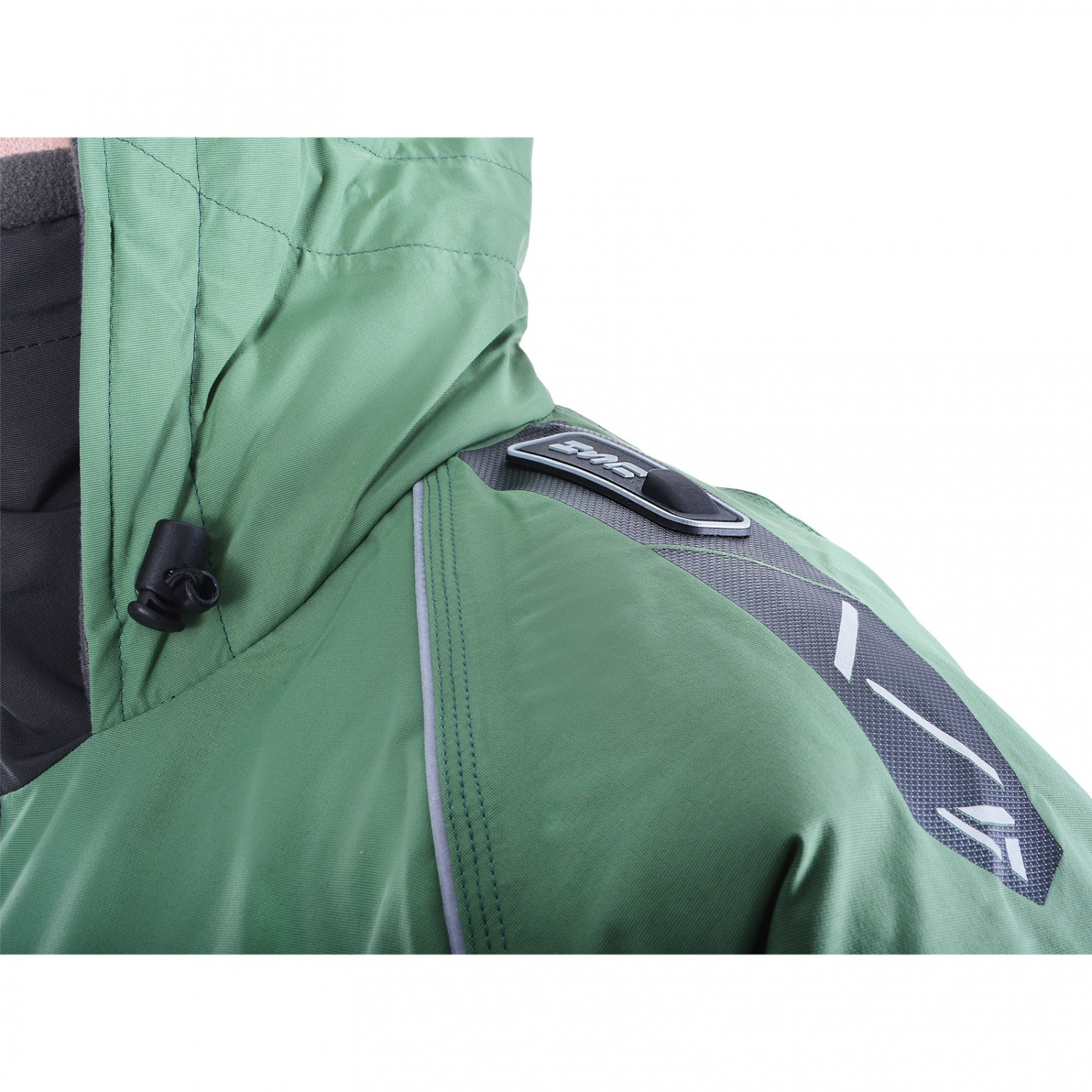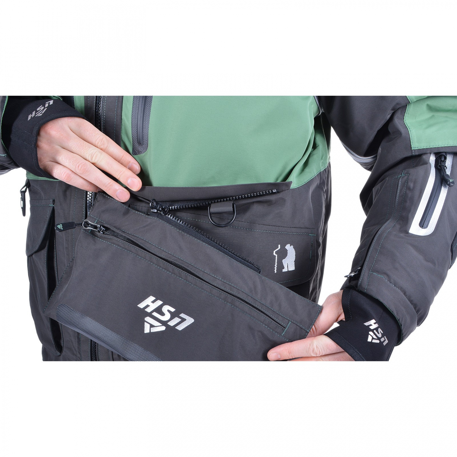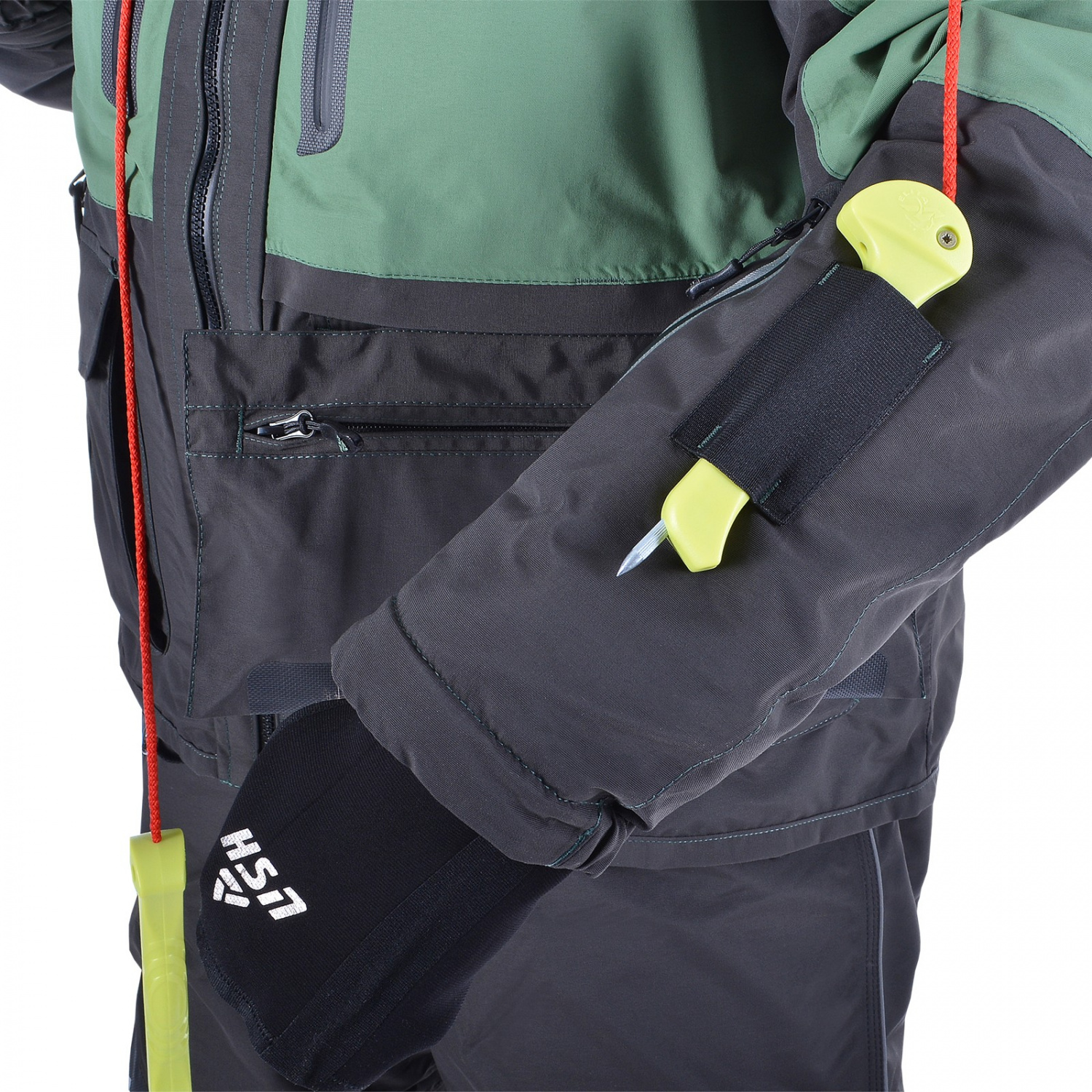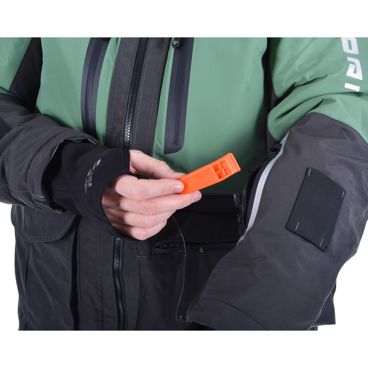 Специальные крепления на рукавах позволяют быстро использовать спасалки, входящие в комплект, в случае падения в воду. Неопреновые манжеты создают максимальный комфорт при контакте с водой. Перфорированные вставки на спинке и рукавах обеспечивают быстрое удаление воды из куртки, облегчая выход из воды при случайном падении. Внутренний влагозащитный карман сохраняет гаджеты сухими.