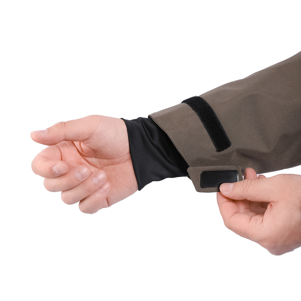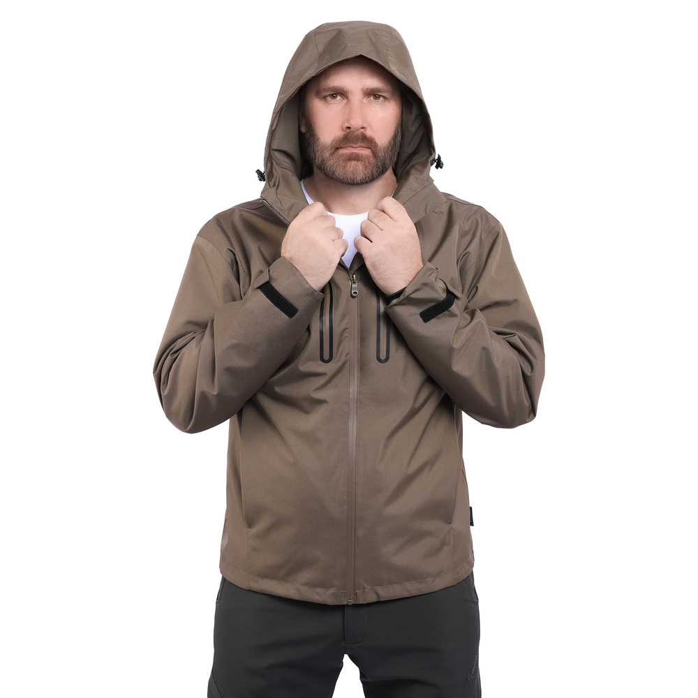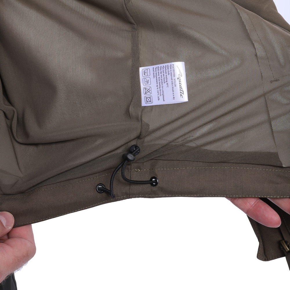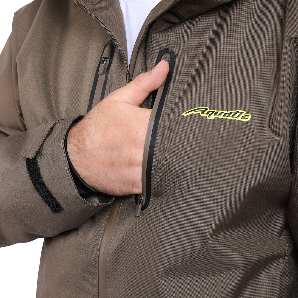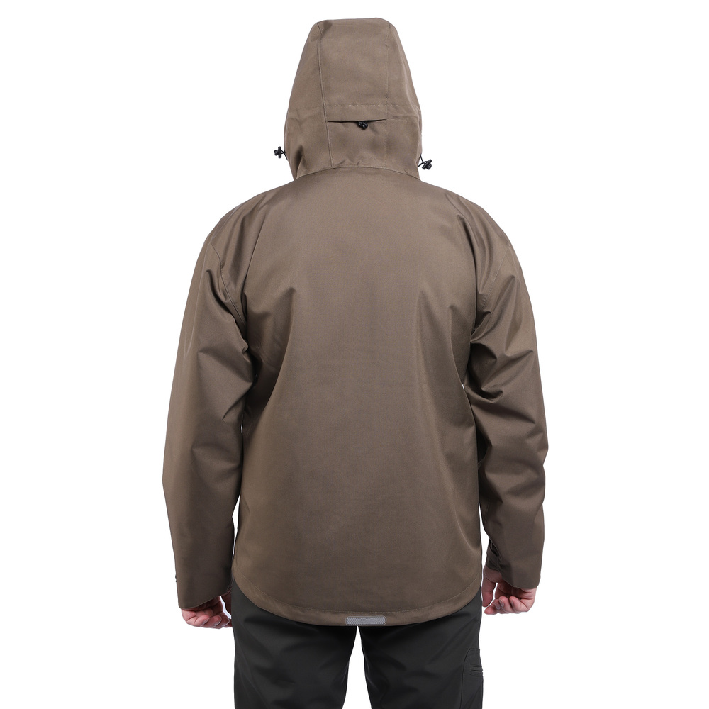 Свободный крой не стесняет движений, благодаря чему куртка не будет мешать активным действиям. Регулируемая кулиса снизу позволяет подогнать куртку под любую фигуру. Влагостойкая молния оснащена дополнительной защитой, предотвращающей травмы подбородка. Куртка оснащена просторным капюшоном с возможностью регулировки. На рукавах предусмотрены надежные липучки, предотвращающие затекание воды внутрь. Для хранения мелочей имеются два нагрудных кармана с влагостойкими молниями и два просторных боковых кармана, куда можно положить небольшие коробки с приманками или другие предметы необходимые на рыбалке.