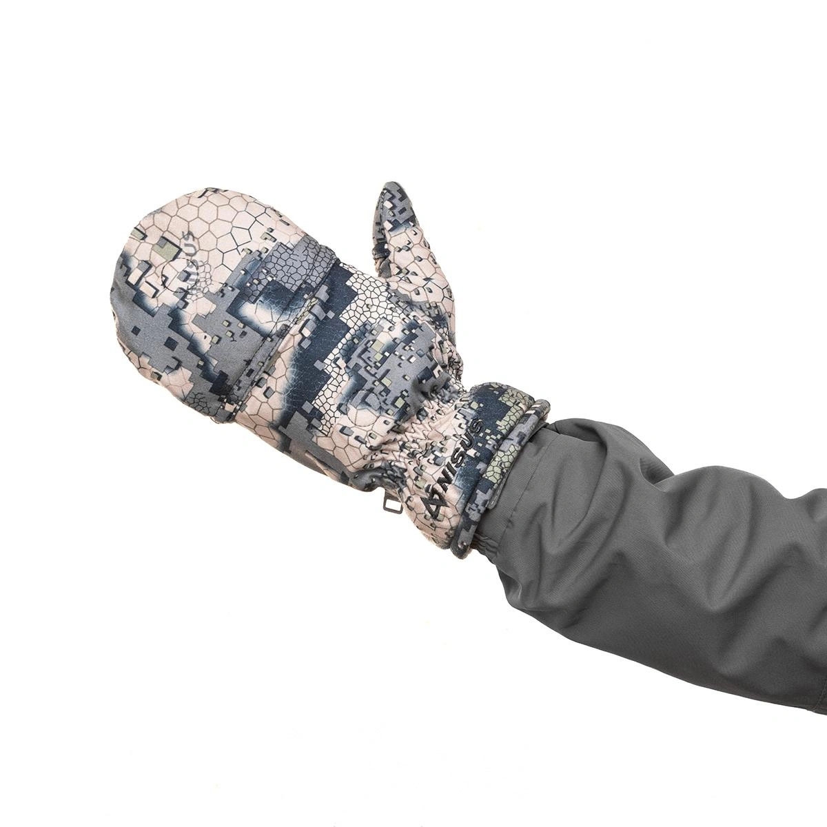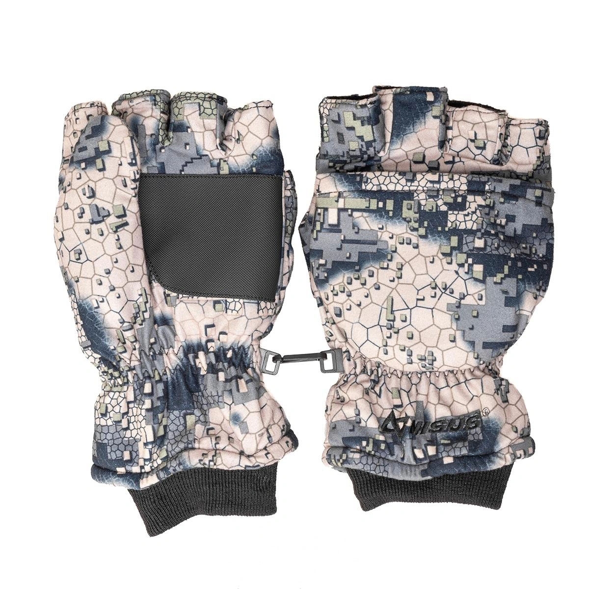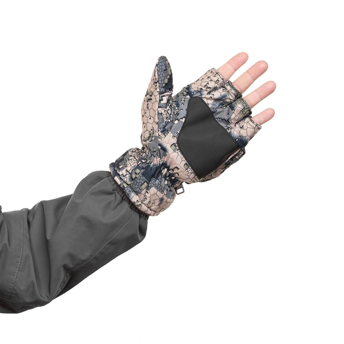 • Варежки с откидной частью достаточно быстро трансформируются в беспалые перчатки, позволяя легко выполнять задачи, требующие высокой чувствительности пальцев. Верхняя откидная часть варежки надежно фиксируется магнитом.