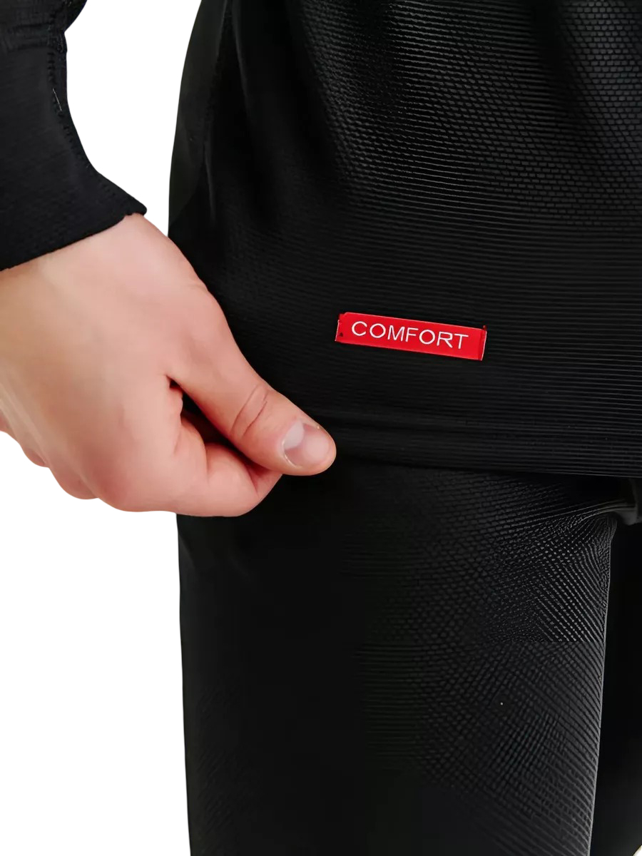 - Комплект: футболка с длинным рукавом, круглый вырез, эластичные манжеты, длинные кальсоны, закрытая резинка.