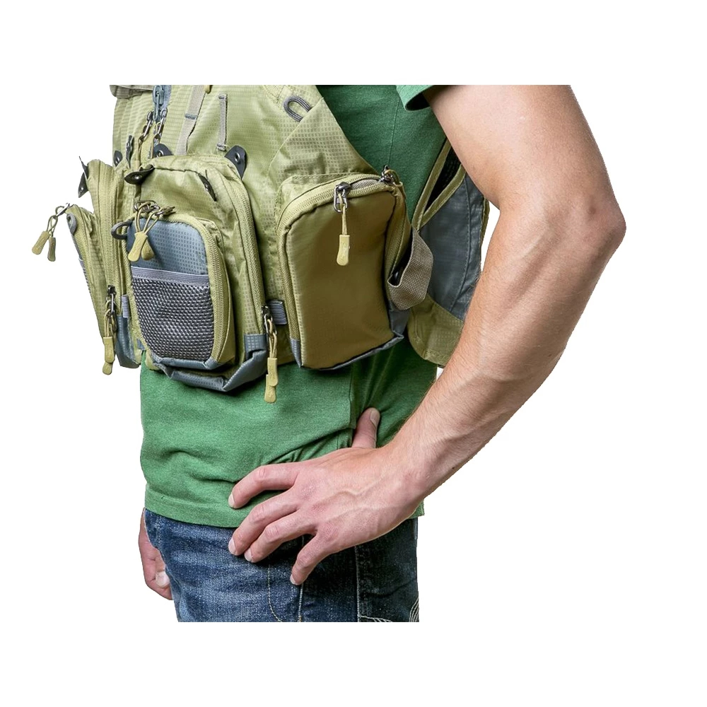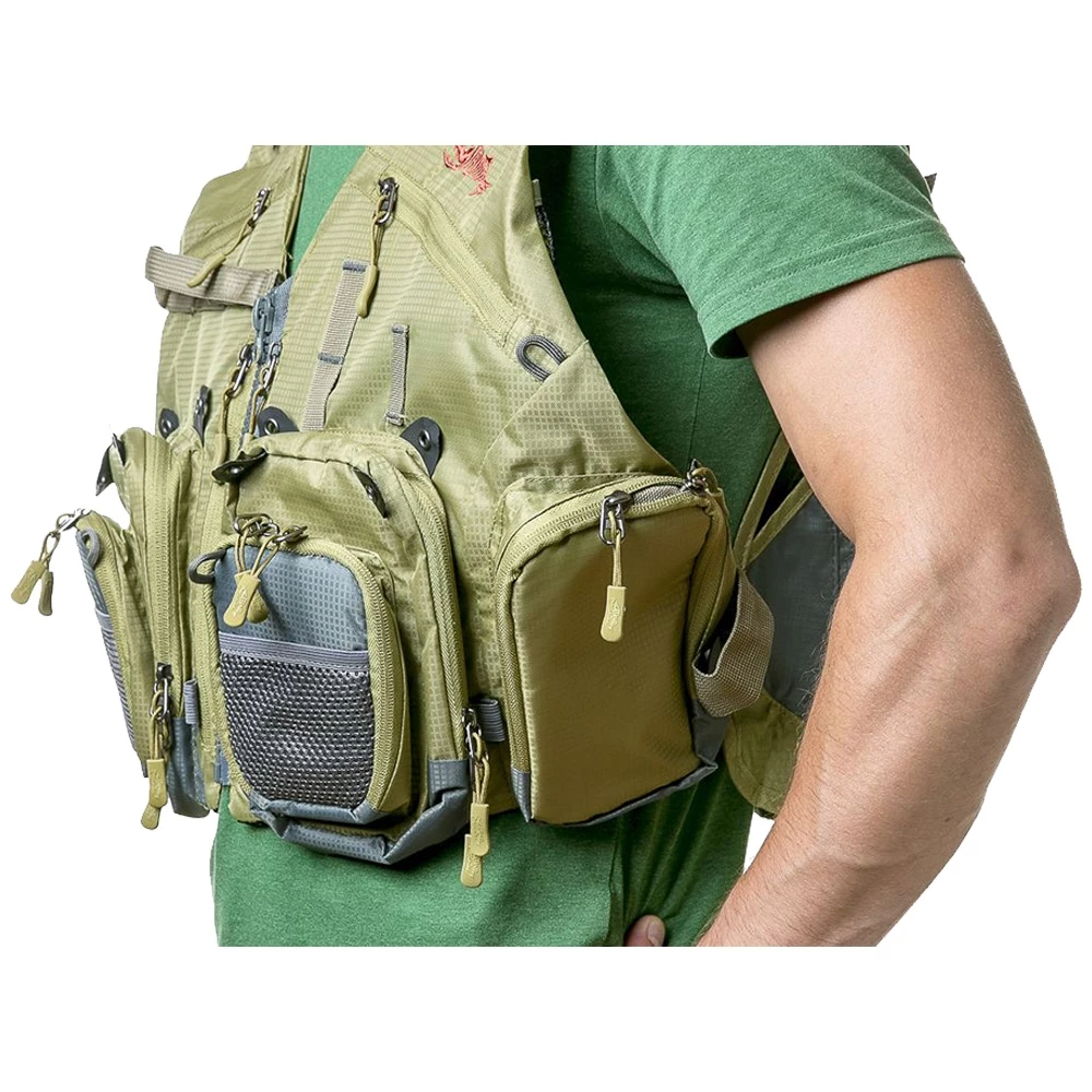 Может носиться как в жаркую, так и в холодную погоду. 17 внешних и внутренних карманов. Карманы имеют тщательно продуманное расположение, специальные отверстия для стока воды. Жилет оборудован системой подвесок, петель и застежек для фиксации рыболовных аксессуаров. Незаменимая вещь для комфортной рыбалки