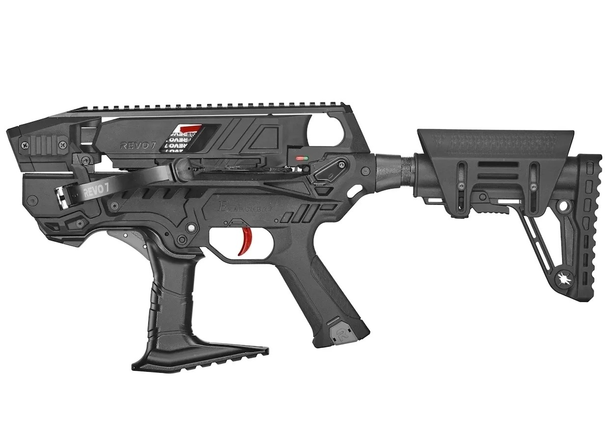 Главная особенность арбалета Revo 7 – невероятная скорострельность, которая достигается благодаря трем факторам: новому короткоходному рычажному механизму, системе быстрой смены магазина, а также использованием сверхтонких карбоновых снарядов.