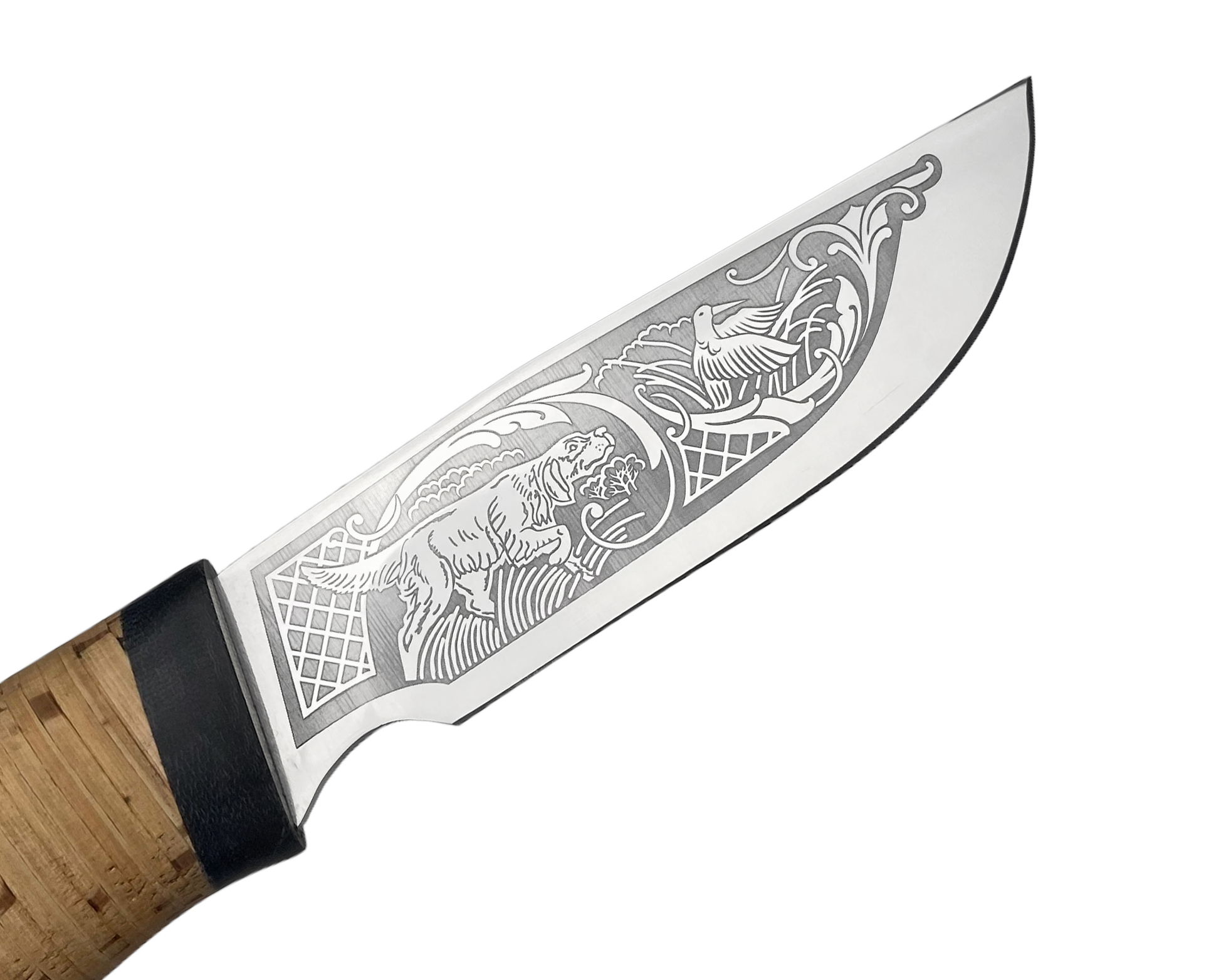 Дополнительный вырез на пяте клинка позволяет владельцу работать 4 различными хватами. Удобная рукоять прочно и удобно ложится в любую ладонь, позволяя комфортную работу с упором указательного пальца в обушок клинка для точных надрезов при мездрении снимаемой шкуры.