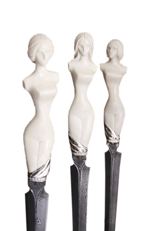 Серия «Грации» — это изящные кабинетные ножи. Рукоятки ножей представляют собой скульптурную миниатюру, вырезанную из бивня мамонта — обнаженная женская фигурка, с бедра которой сползает серебряная ткань.