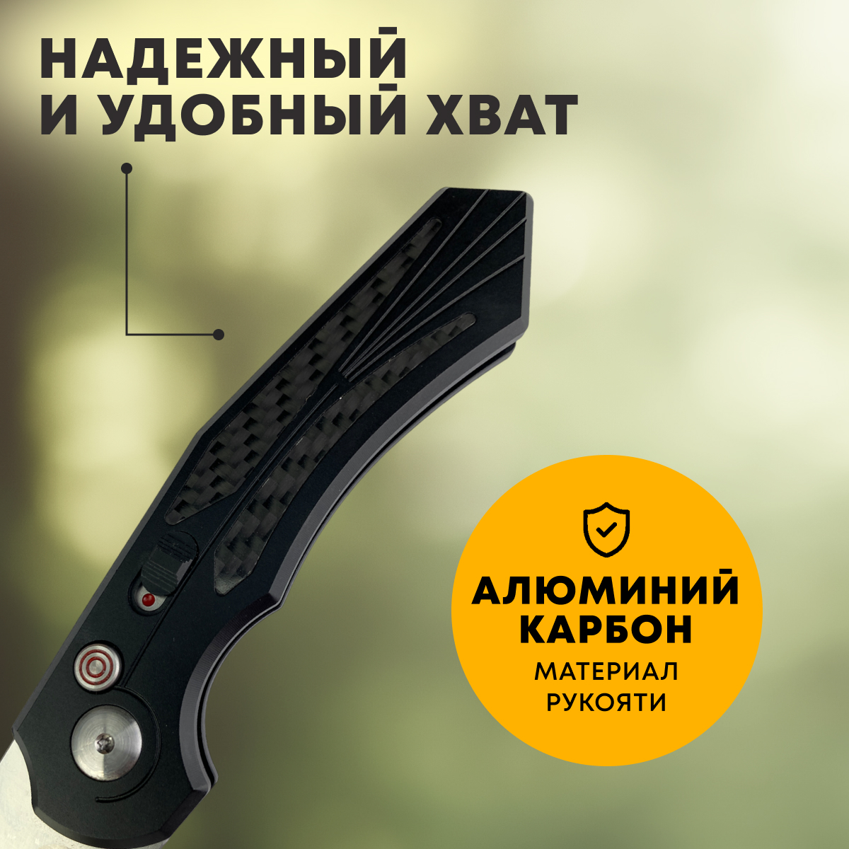 Прочная и легкая рукоять из алюминия и карбонаКарбон Карбон, или углепластик - материал на основе углеродных волокон, залитых полимером. Карбон прочный и упругий, но весьма хрупкий. ПодробнееРукоять изготовлена из алюминия и карбонаКарбон Карбон, или углепластик - материал на основе углеродных волокон, залитых полимером. Карбон прочный и упругий, но весьма хрупкий. Подробнее , что делает ее одновременно прочной и легкой. Благодаря эргономичной форме и рифленым вставкам, нож удобно лежит в руке, обеспечивая надежный хват даже в условиях повышенной влажности или при работе в перчатках.