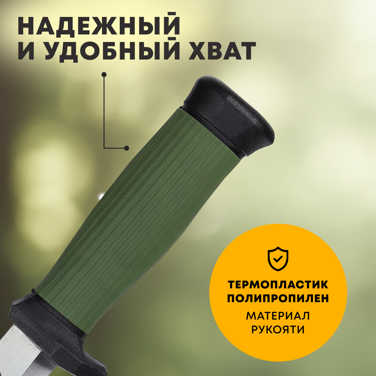 Надежный захват и комфорт при использованииРукоять ножа выполнена из комбинации TPRTPR - это технология изготовления рукояти или оболочки, которая использует материал под названием термопластичный каучук (Thermoplastic Rubber, TPR). TPR является типом синтетического эластомера, который обладает определенными свойствами, делающими его идеальным для изготовления рукояток, ручек и других деталей различных изделий.Подробнее и полипропиленаPolypropylene - обладает высокой стойкостью к кислотам, щелочам, растворам солей и другим неорганическим агрессивным средам.Подробнее . Эти материалы обеспечивают надежный захват даже в мокрых или сложных условиях, предотвращают скольжение и уменьшают усталость руки при длительном использовании. Это особенно важно для тех, кто проводит много времени на природе.