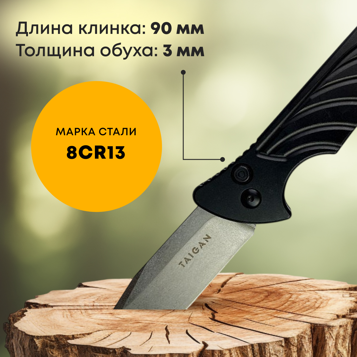 Клинок ножа Taigan Swift выполнен из стали 8Cr138Cr13 — это китайская нержавеющая сталь с высоким содержанием углерода (0,8%) и средним содержанием хрома (13%). Также в её состав входят молибден и ванадий. Среди клинковых сталей китайского производства этот сплав считается одним из лучших и близок по свойствам к популярной японской стали AUS-8.Подробнее, которая отличается высокой устойчивостью к коррозии и механическим повреждениям. Это особенно важно для охотников, рыболовов и туристов, так как нож сохраняет свои свойства даже в условиях повышенной влажности и интенсивного использования.