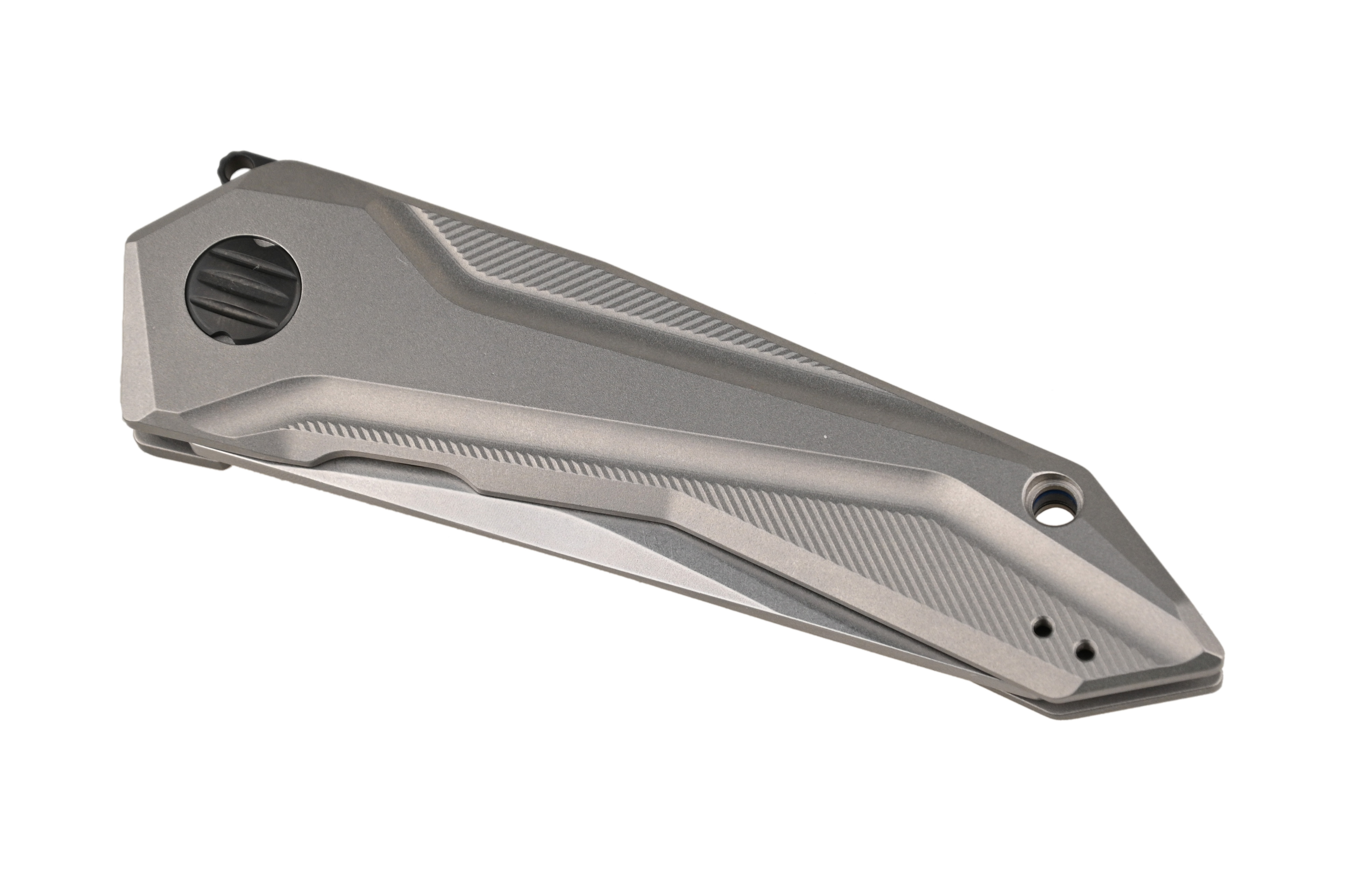 В основе этой модели лежит один из самых успешных кастомных ножей GTC Knives — Airborne. Серийную модель отличает урбанистический строгий дизайн и непростое технологически исполнение — клинок сложной фактуры из порошковой стали и рукоять из титанового сплава.