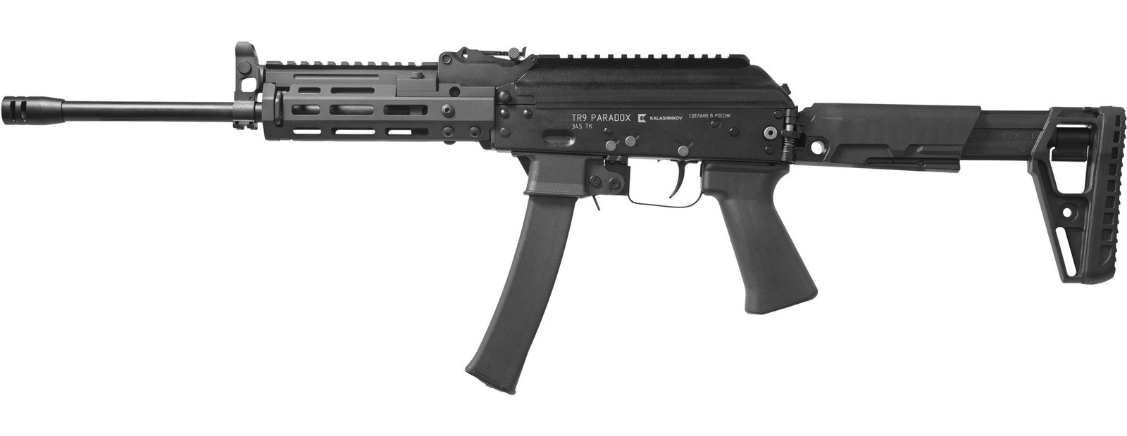 Самозарядный карабин TR9 PARADOX под патрон 345ТК разработан на базе 9мм карабина Сайга-9. Особенностью изделия является максимальная унификация с Сайгой-9, сверловка ПарадоксПарадокс - Система «Парадокс» — гладкий ствол имеет в дульной части нарезку не превышающую 14 см. Эта конструкция ствола позволяет значительно повысить кучность при стрельбе пулей, одновременно оставляя возможность стрелять дробью.Подробнее в дульной части ствола, хромированные канал ствола и патронник, а также алюминиевое цевье с накладкой на газовую трубку и телескопический приклад АК-ЭВО.