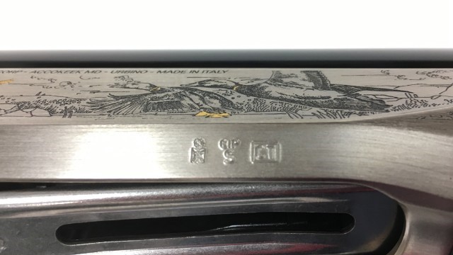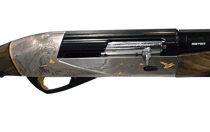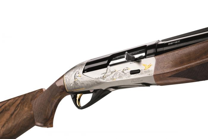 для снижения отдачи. Ружьё исполнено в светлых и тёмных тонах, позолота в отделке. Технология этого ружья дополнительно усовершенствована технологией B.E.S.TB.E.S.T - алмазоподобное покрытие металлических частей оружия. Устойчиво к абразивному износу и коррозии, снижает трение на подвижных деталях.