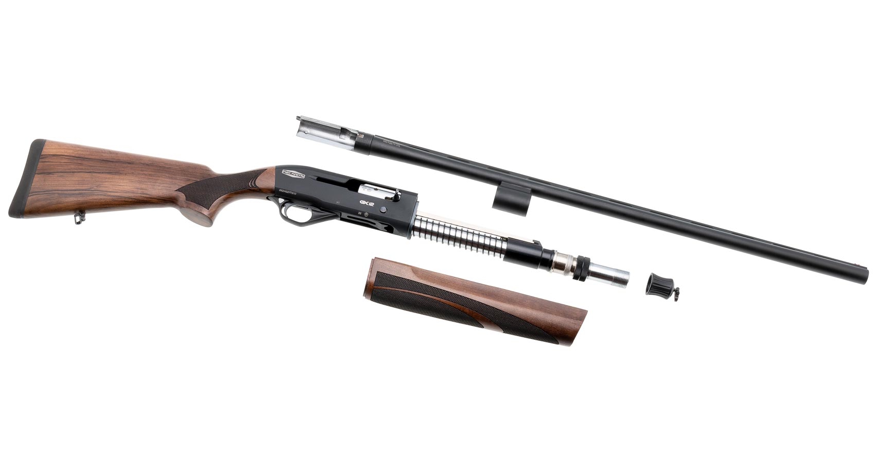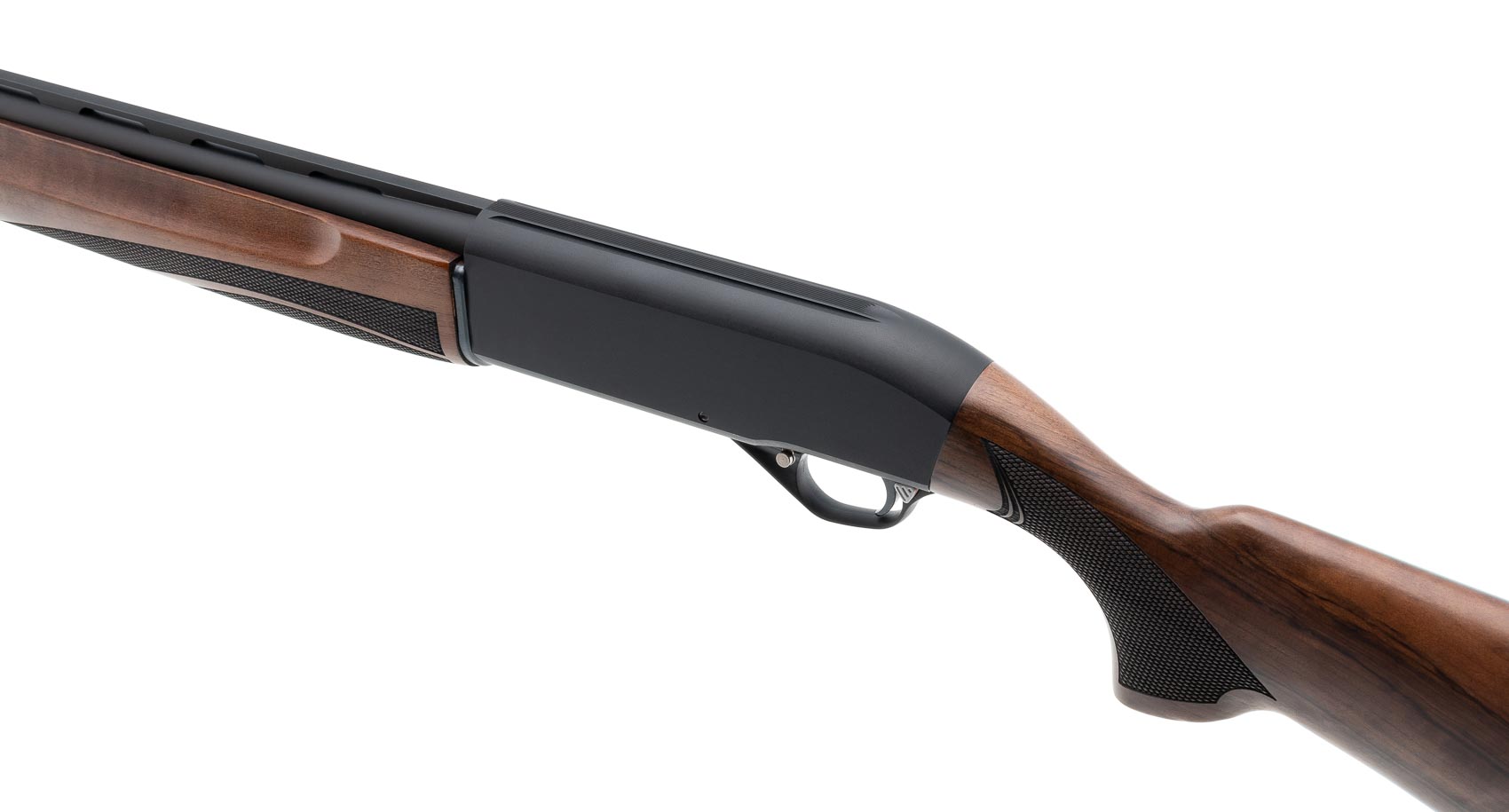 Приклад и цевье изготовлены из древесины ореха с насечкой в местах хвата, что гарантирует надежный захват и комфорт при стрельбе. Приклад оснащен амортизирующим затыльником, который снижает отдачу и повышает удобство использования.