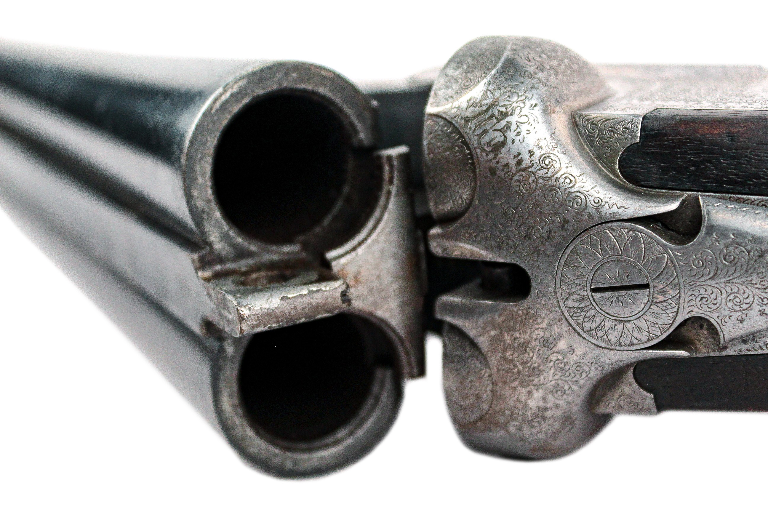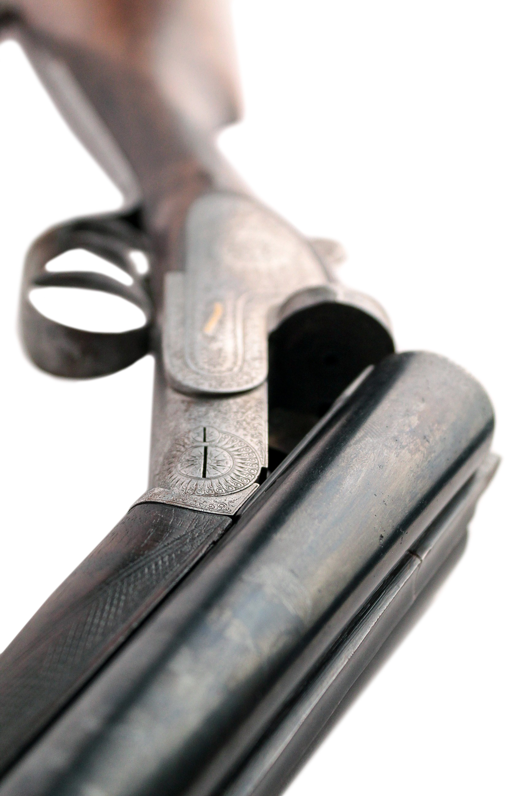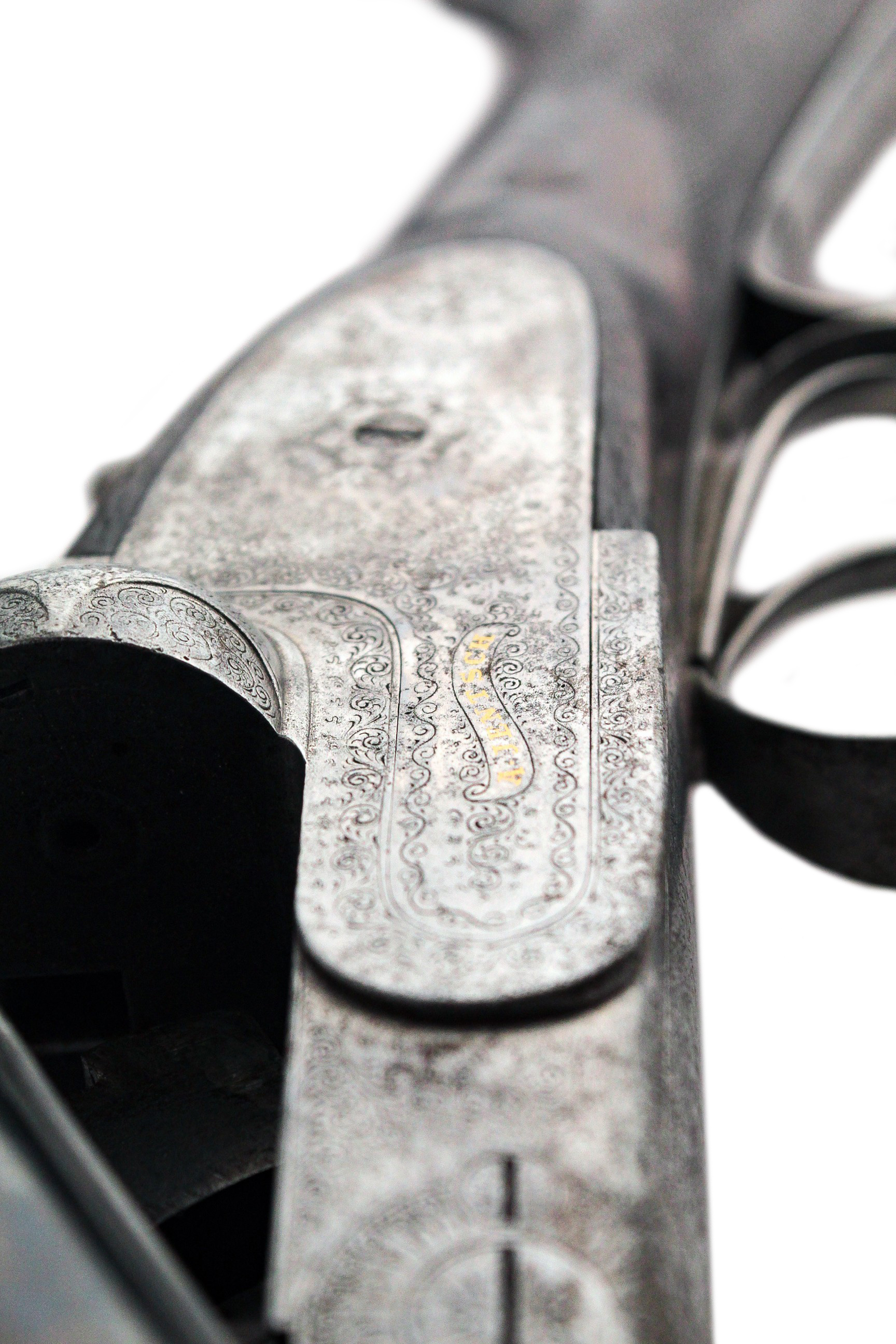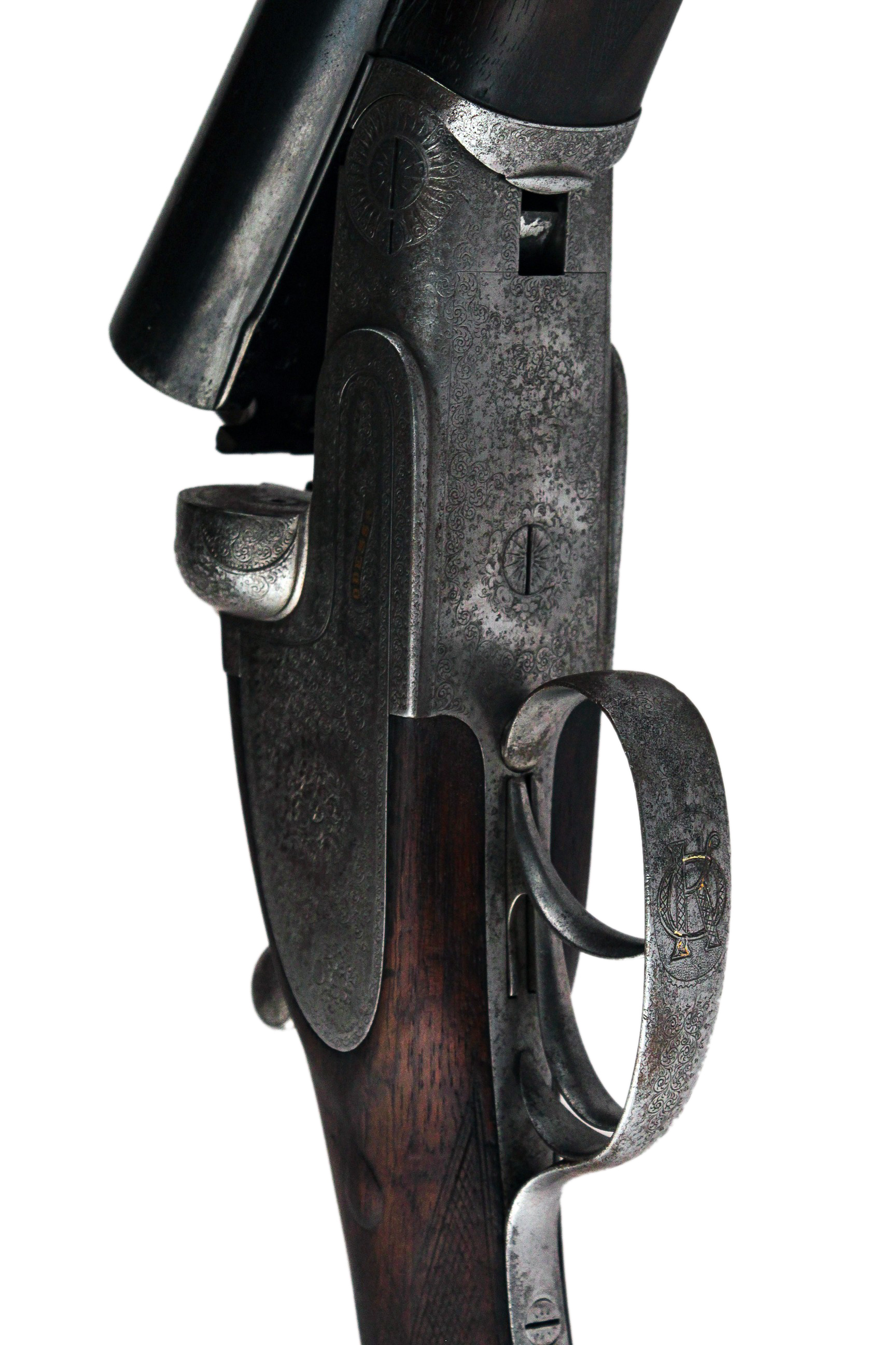Казенники стволов украшены золотой инкрустацией и стилизованы геометрически-растительным орнаментом.