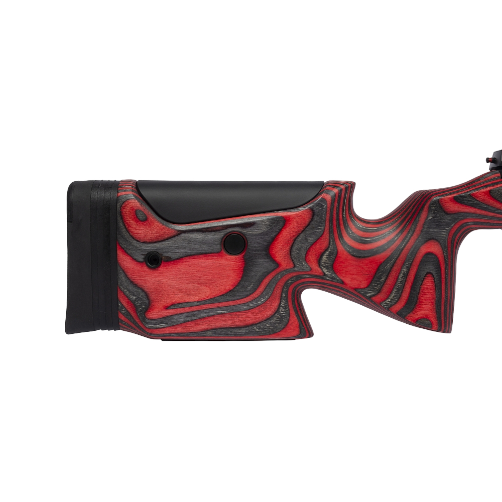 Ламинированная ложа красного цвета. Приклад с подщечником и утолщенным затыльником для поглощения отдачи. Пистолетная рукоять для надежного удержания во время стрельбы.