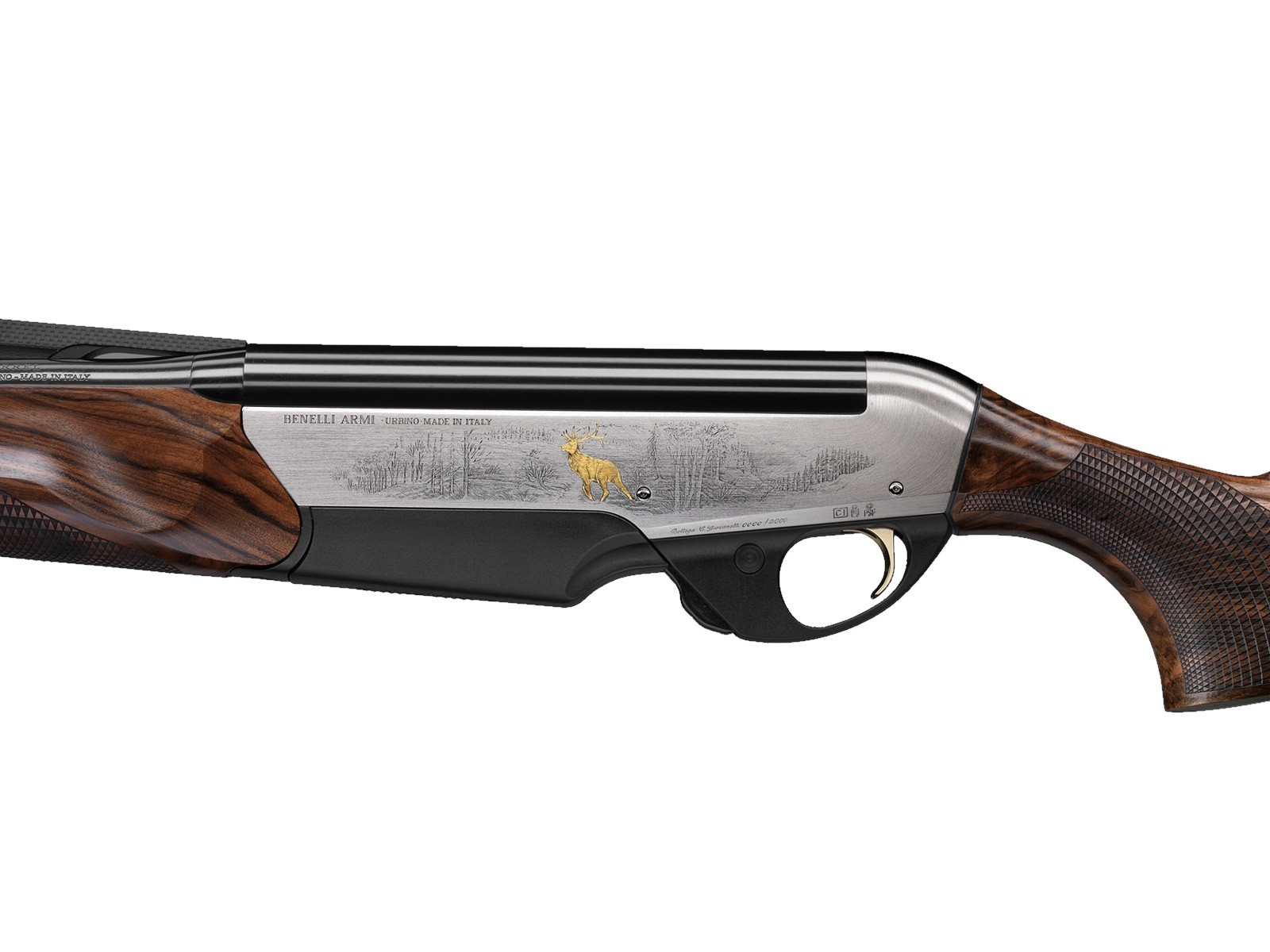 На правой стороне ствольной коробки этого самозарядного нарезного оружия Benelli 308Win калибра изображён стремительно бегущий кабан, а на левой – благородный олень, настороженно всматривающийся вглубь леса. Позолоченные фигуры подчёркивают элегантность и утончённость отделки карабина Бенелли.
