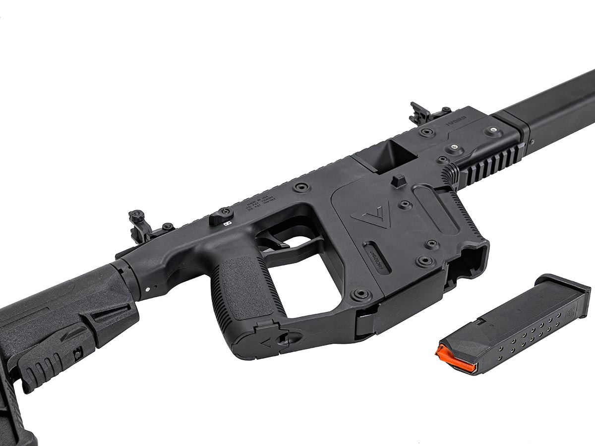 Карабин KRISS Vector CRB G2 совместим с магазинами от пистолета Glock 17/19, как с короткими, так и с удлинёнными. Органы управления, как и сам карабин, выполнены оригинально, однако, очень удобно: привыкнуть к ним не составит труда. Карабин поставляется с телескопическим 6-ти позиционным прикладом с креплением M4 и складными механическими прицельными приспособлениями. Планка Picatinny на ствольной коробке позволяет установить на карабин оптику, на нижней части — дополнительные аксессуары, например тактический фонарь или ЛЦУ.