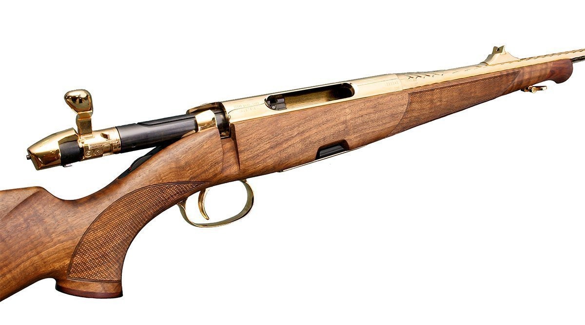 Нарезной карабин Mannlicher Classic Special Engraving Gold — один из самых эффектных представителей серии Steyr, выделяющийся стильным дизайном и высокой надежностью. Он имеет необычное исполнение – вставки натуральной кожи в ложе и покрытие металлических частей в натуральном золоте, высочайшей пробы 24 карата.