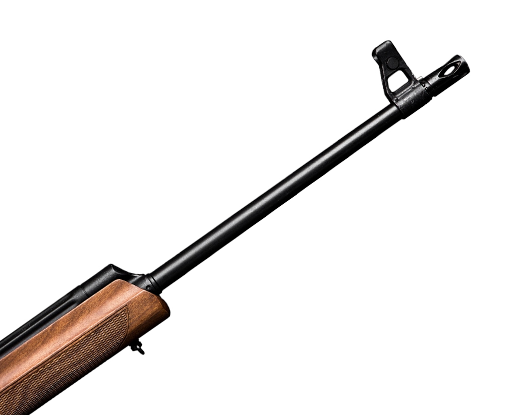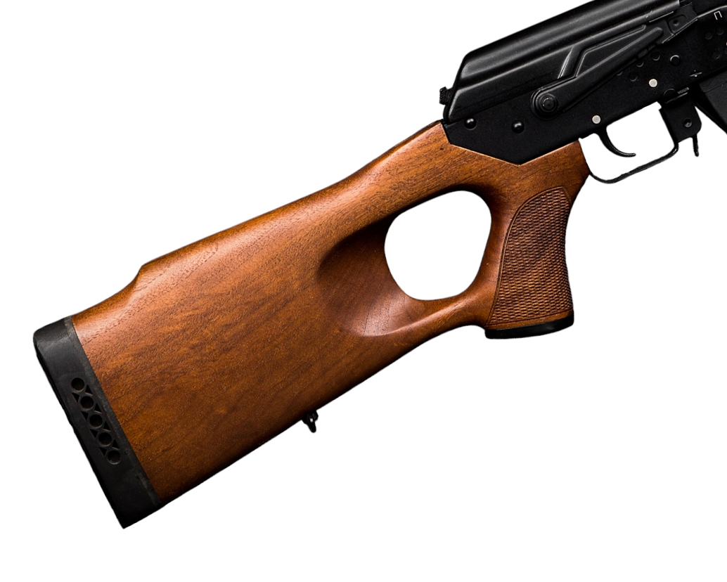 Цевье и ортопедический приклад с резиновым затыльником выполнены из ореха. Питание карабина производится из отъемного магазина.