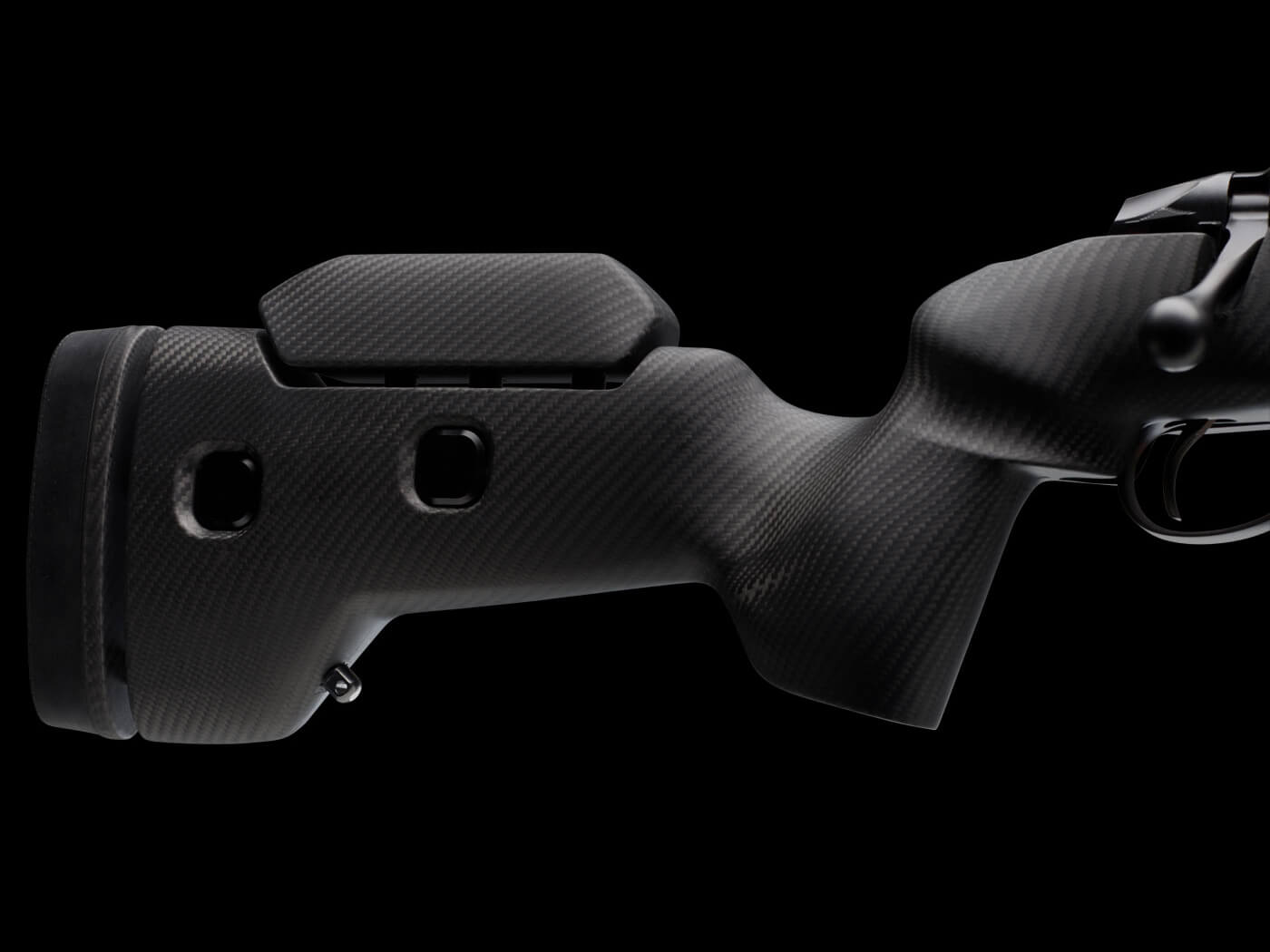 Одноступенчатый спусковой механизм позволяет регулировать усилие спуска в диапазоне от 1 до 2 кг, обеспечивая точность и удобство стрельбы. Ложа карабина выполнена из карбонаКарбон Карбон, или углепластик - материал на основе углеродных волокон, залитых полимером. Карбон прочный и упругий, но весьма хрупкий. Подробнее — легкого и прочного композитного материала на основе углерода. Щека приклада регулируется, также возможна регулировка длины приклада. На цевье и прикладе имеются антабки для крепления ремня.
