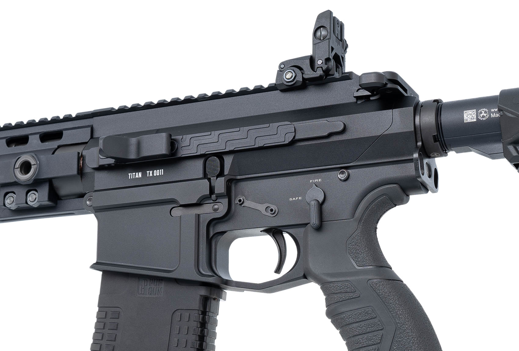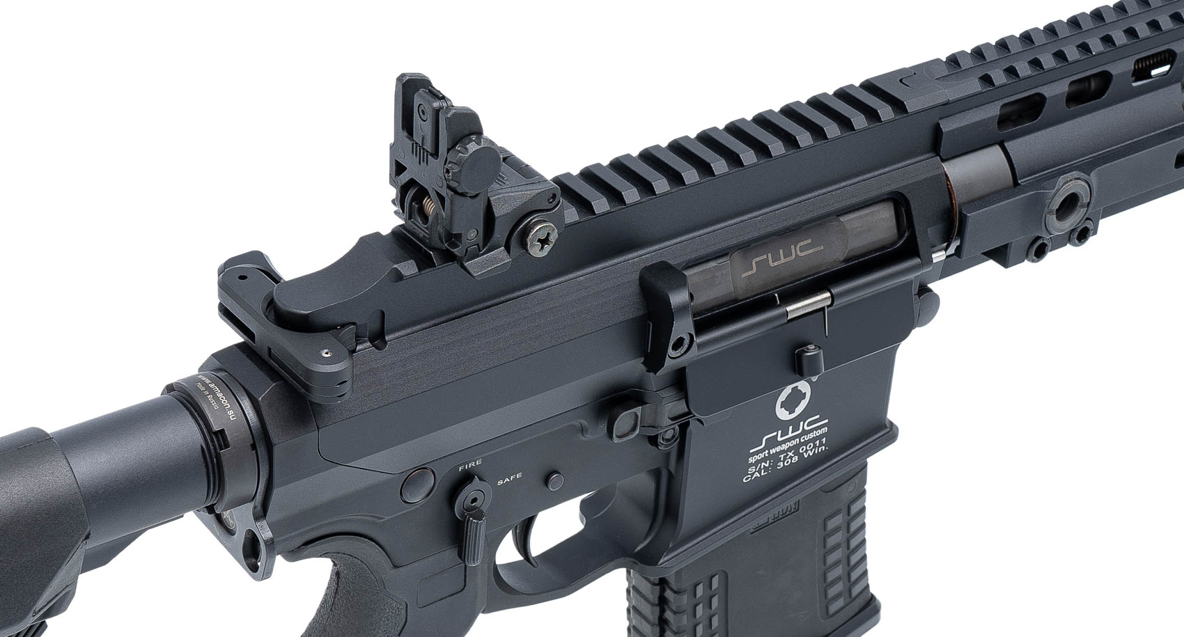 Карабин Titan от российской компании Sport Weapon Custom - полуавтоматическая модель в тактическом исполнении, с газоотводной системой автоматики, сконструированная на основе карабинов семейства AR-15. Прицельные приспособления - съемные, складные, представлены регулируемым диоптром и мушкой. Имеется возможность установки оптического или коллиматорного прицела на планку PicatinnyPicatinny - кронштейн рельсового типа, применяемый на разных типах стрелкового оружия для обеспечения универсальности крепления прицелов.Подробнее, имеющуюся на верхнем ресивере и цевье.