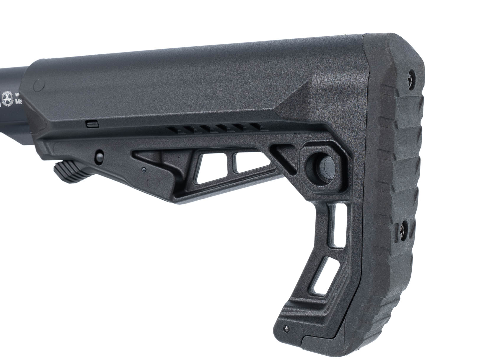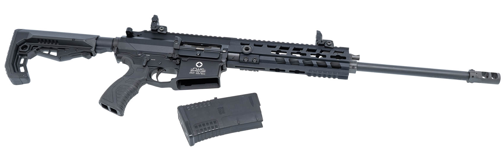 Ресиверы выполнены из алюминиевого сплава 70757075 - это сплав алюминия с цинком, разработанный японской компанией Sumitomo Metal. Подробнее с анодированным покрытием. Приклад телескопический, с возможностью регулировки (несколько фиксированных положений). Цевье выполнено из алюминиевого сплава с покрытием черного цвета; на нем имеется подствольная планка PicatinnyPicatinny - кронштейн рельсового типа, применяемый на разных типах стрелкового оружия для обеспечения универсальности крепления прицелов.Подробнее для крепления ЛЦУ, фонарика, сошек, тактической рукояти и т.п. аксессуаров. На дульной части ствола имеется резьба 5/8"-24, штатно на нее установлен ДТК. Для исключения случайного выстрела карабин оснащен предохранителем.