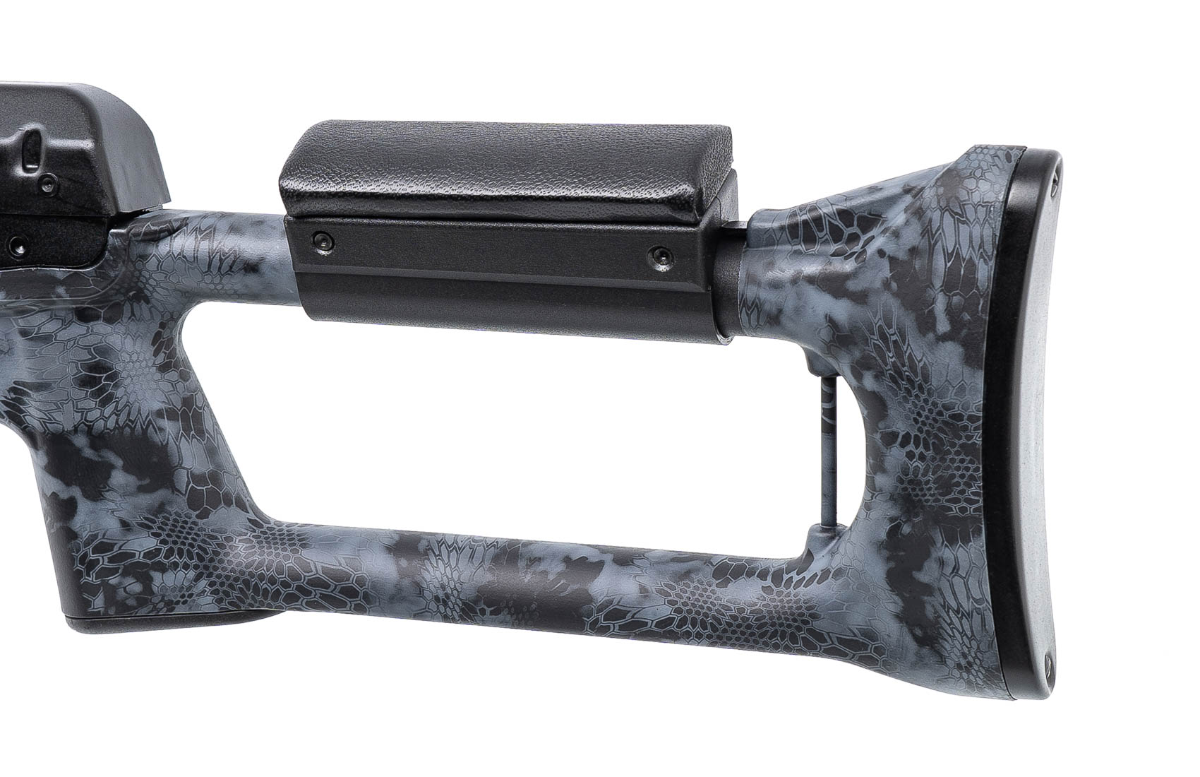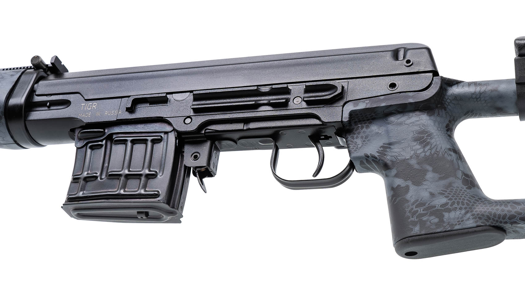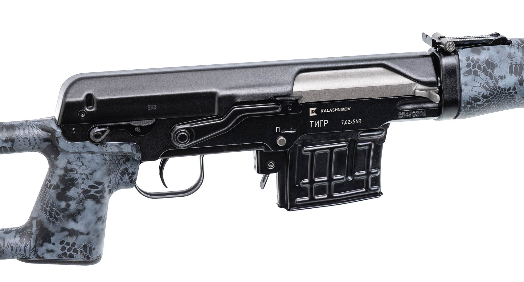 Карабин Тигр производства Ижевского машиностроительного завода - полуавтоматическая модель с газоотводной системой автоматики и газовым регулятором, калибра 7,62Х54R, в тактическом исполнении, предназначенная для охоты, но ее также можно использовать и для спортивной стрельбы. Ложа предлагаемого варианта выполнена в камуфляжной расцветке "Криптек черный".