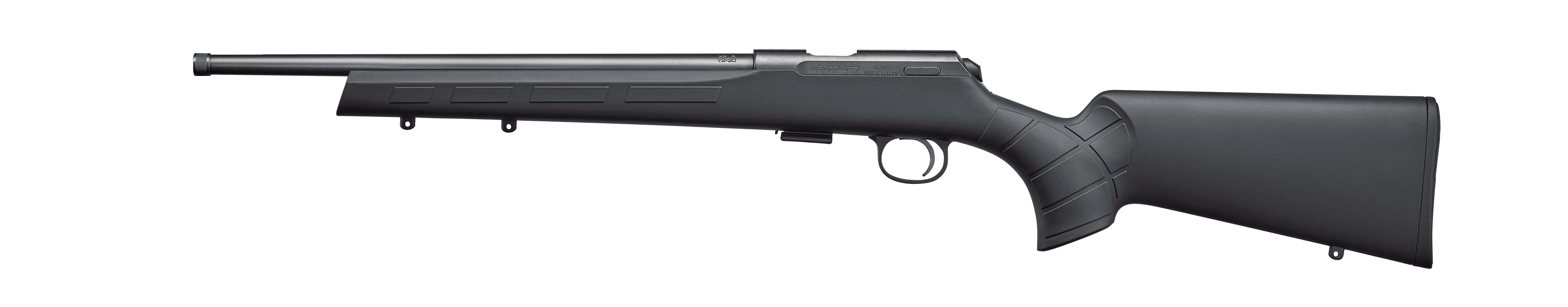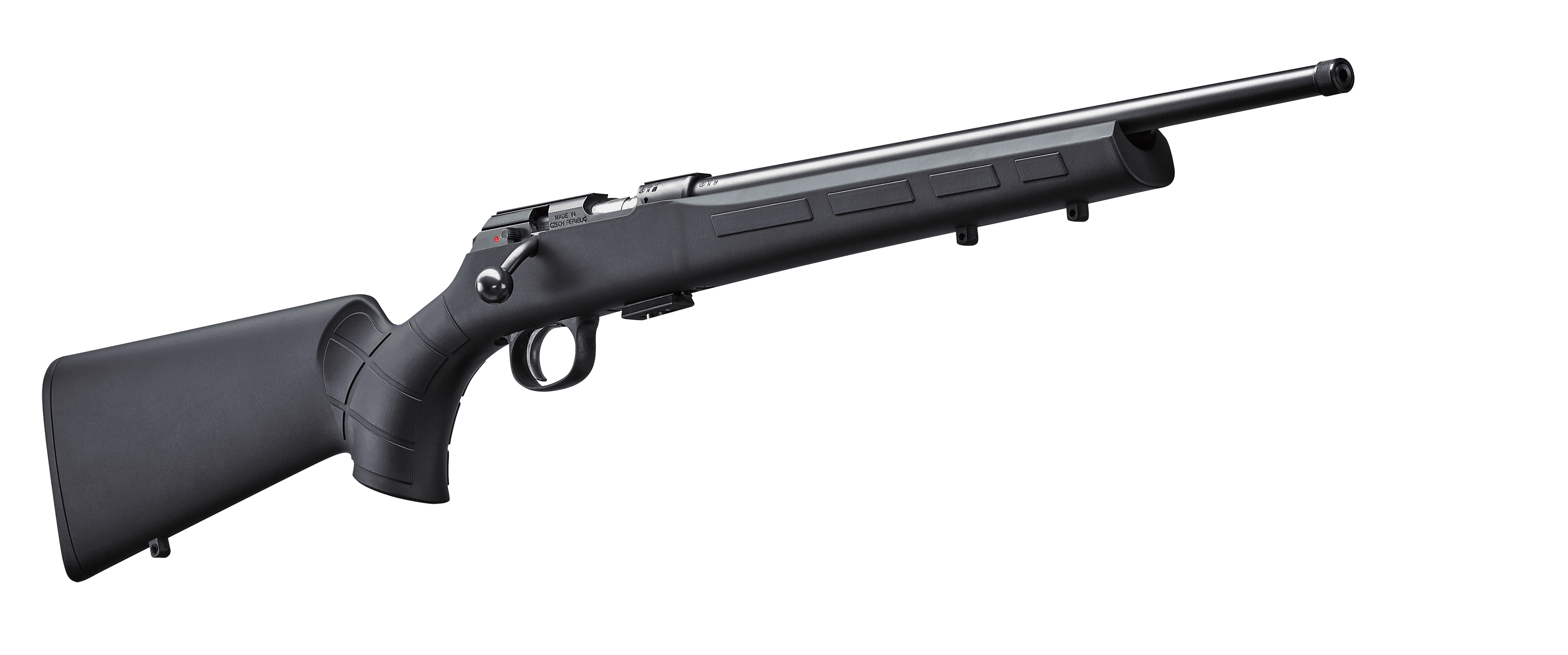 Внешние прицельные приспособления отсутствуют. Карабин CZ 457 SYNTHETIC унаследовал модульную систему стволов. Оснащен модифицированным предохранителем. Фиксатором затора на правой стороне. Индикатором взведения. Регулируемым УСМ. Облеченным ударником. Ложа из черного полимерного пластика. Приклад с резиновым затыльником для поглощения отдачи. Пистолетная рукоять и цевье с текстурированием для надежного удержания во время стрельбы. Отъемным магазином на 5+1 патронов. Модель совершившая огромный скачек в сравнении с предшественником.