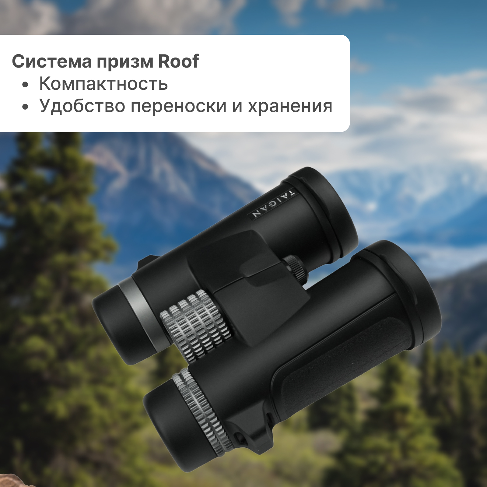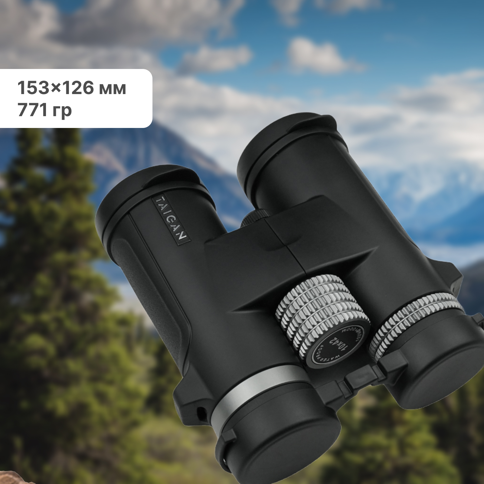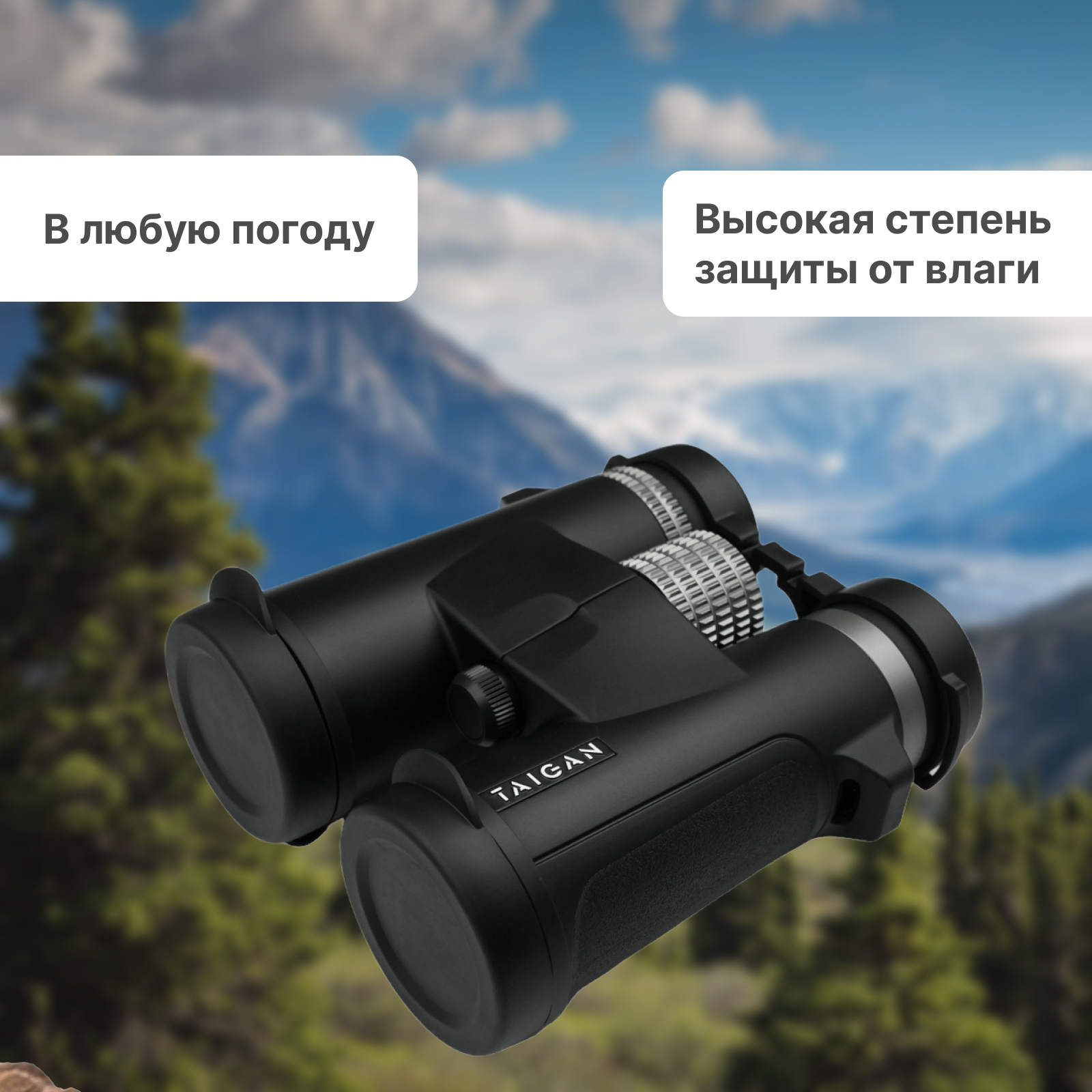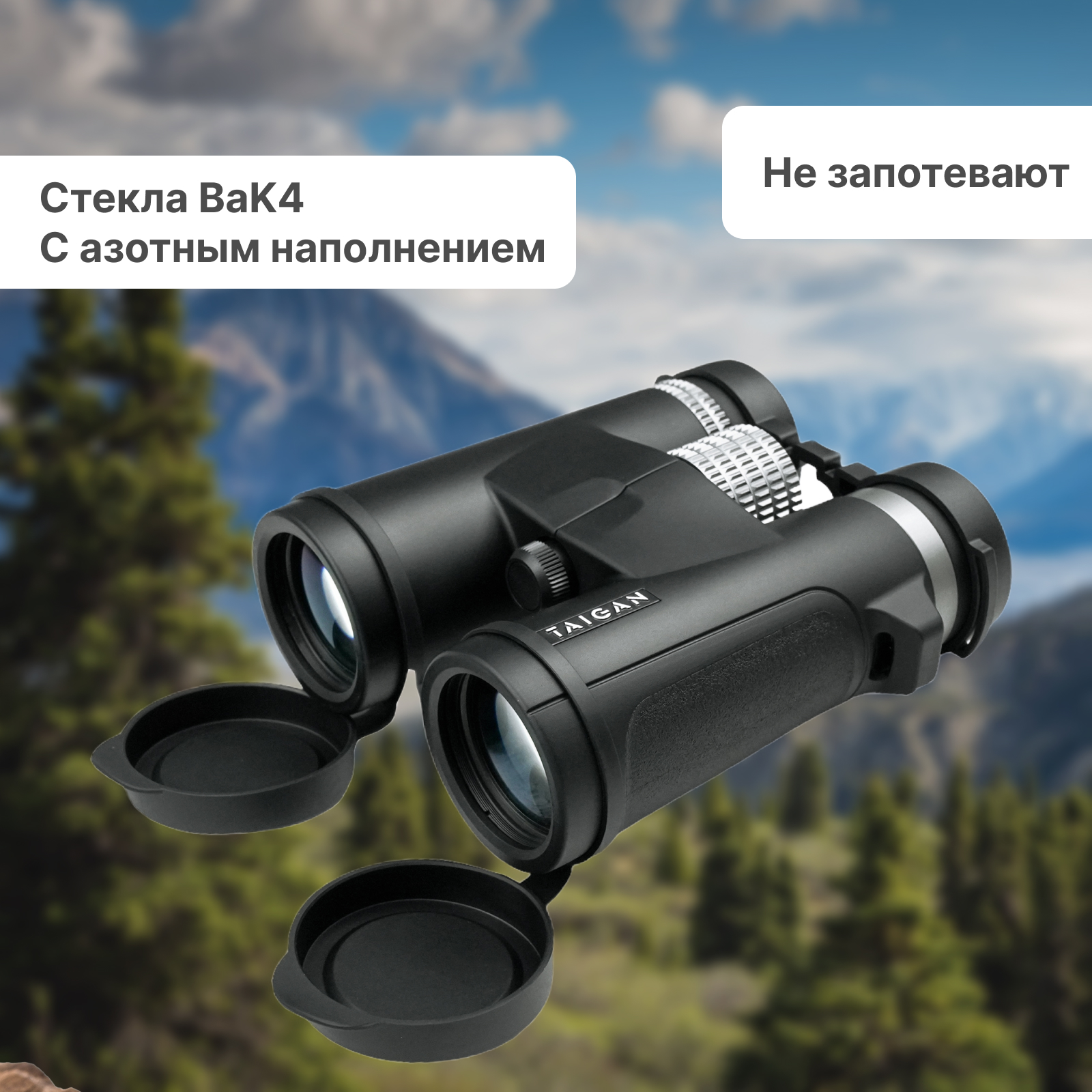 Бинокль оснащен системой призм типа RoofRoof – система призм, позволяющая значительно уменьшить габариты оптики.Подробнее , которая позволяет уменьшить габариты прибора и сделать его более компактным и удобным для переноски и хранения. Благодаря заполнению азотом, Taigan 10X42 обладает влагостойкостью и защищен от запотевания, что позволяет получать четкое изображение в любых погодных условиях.