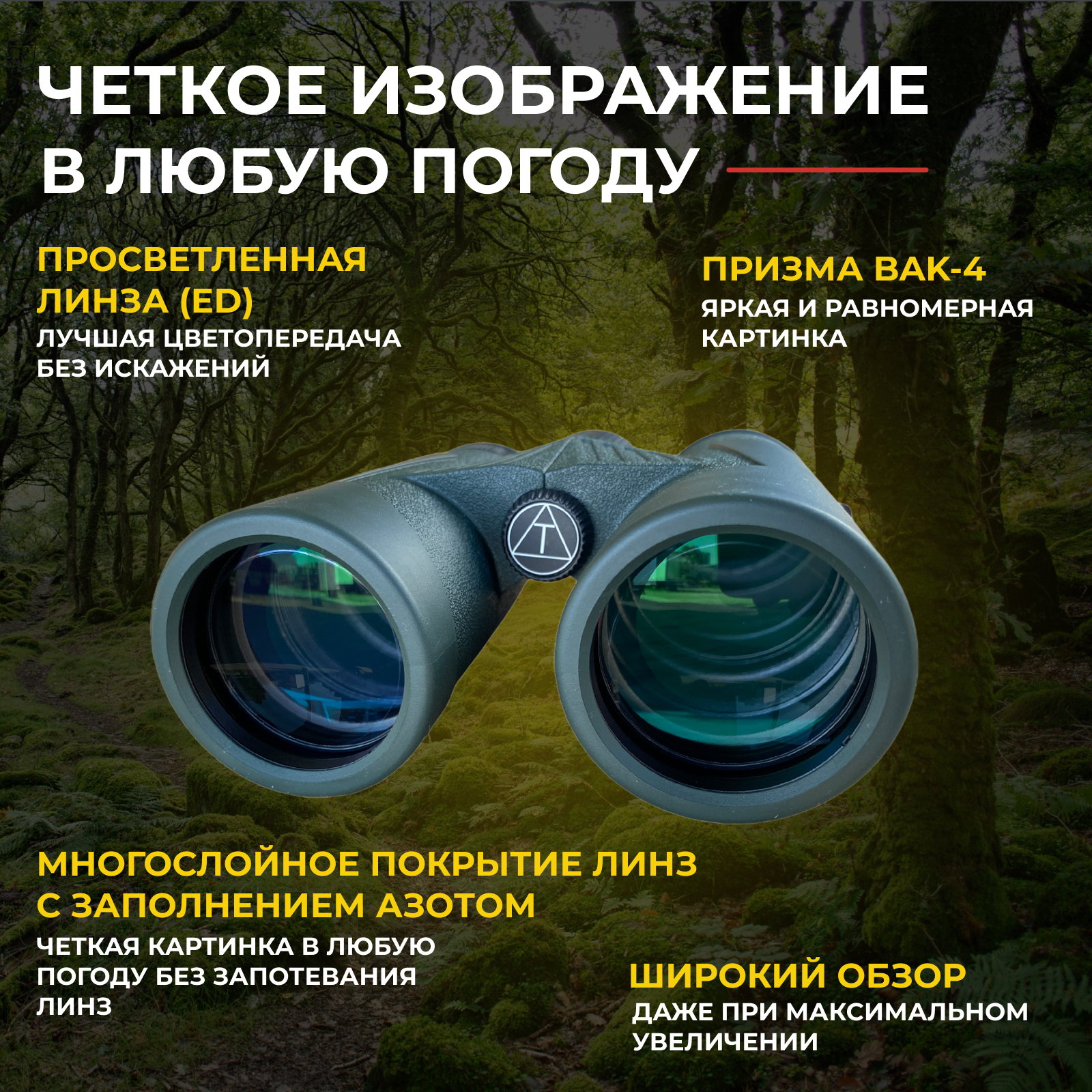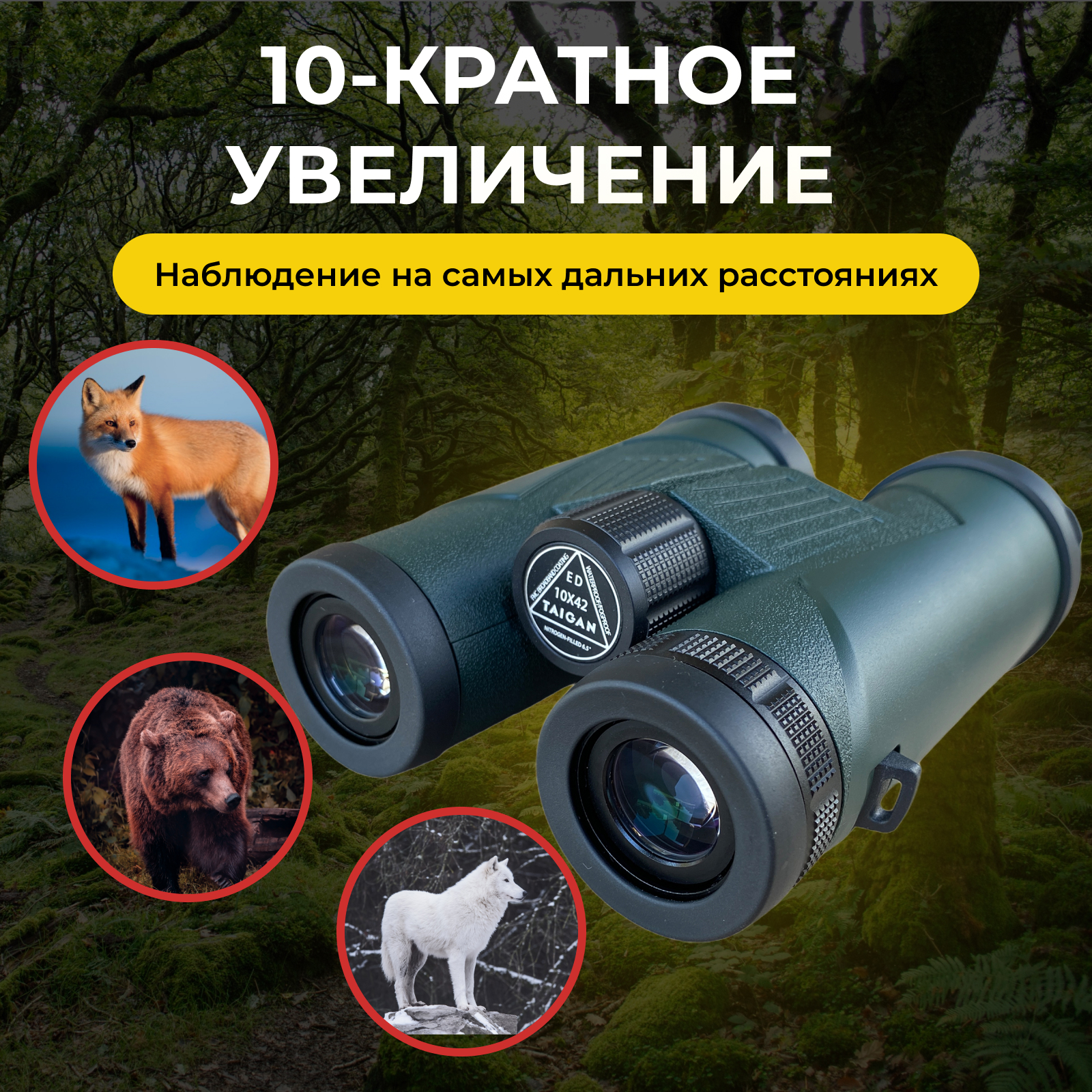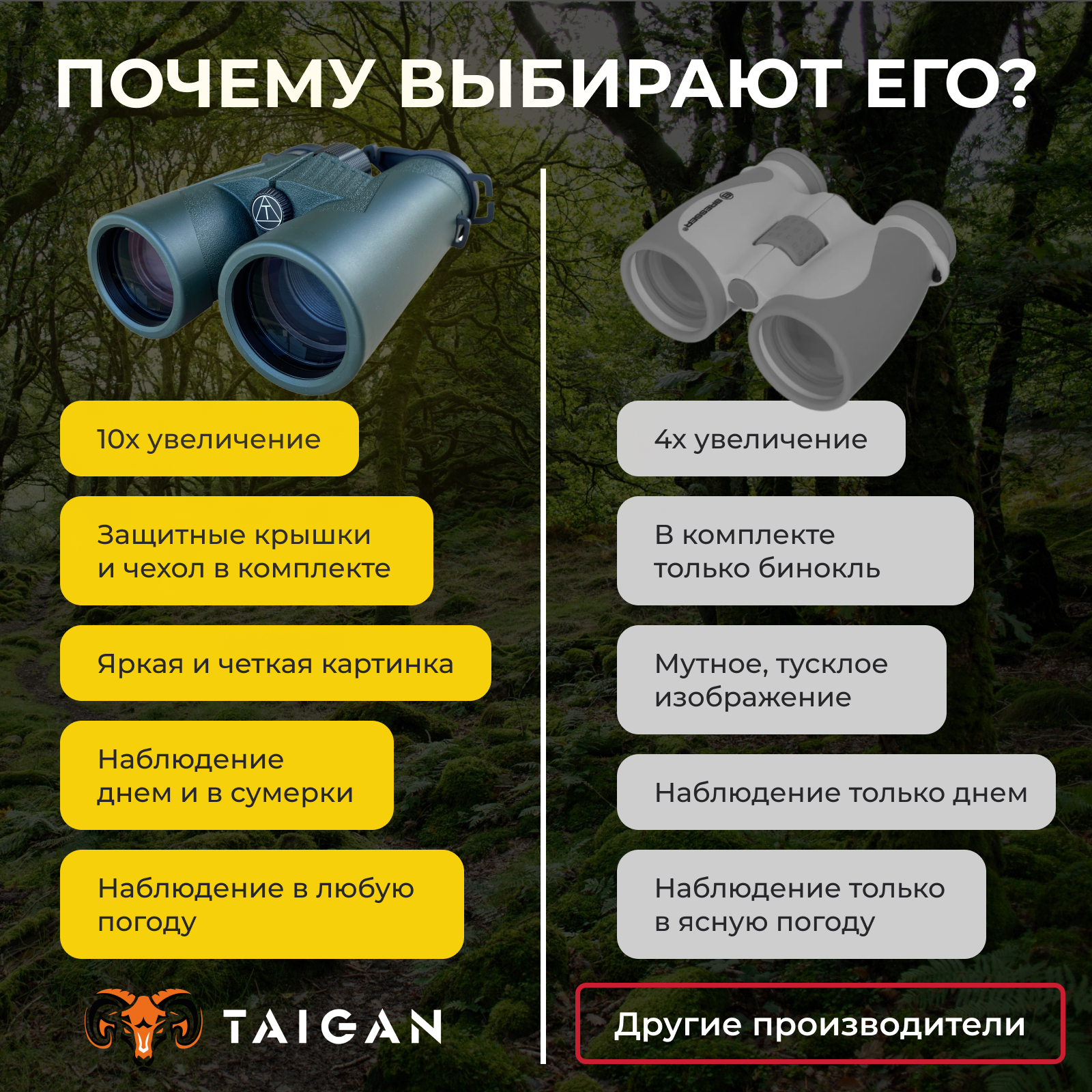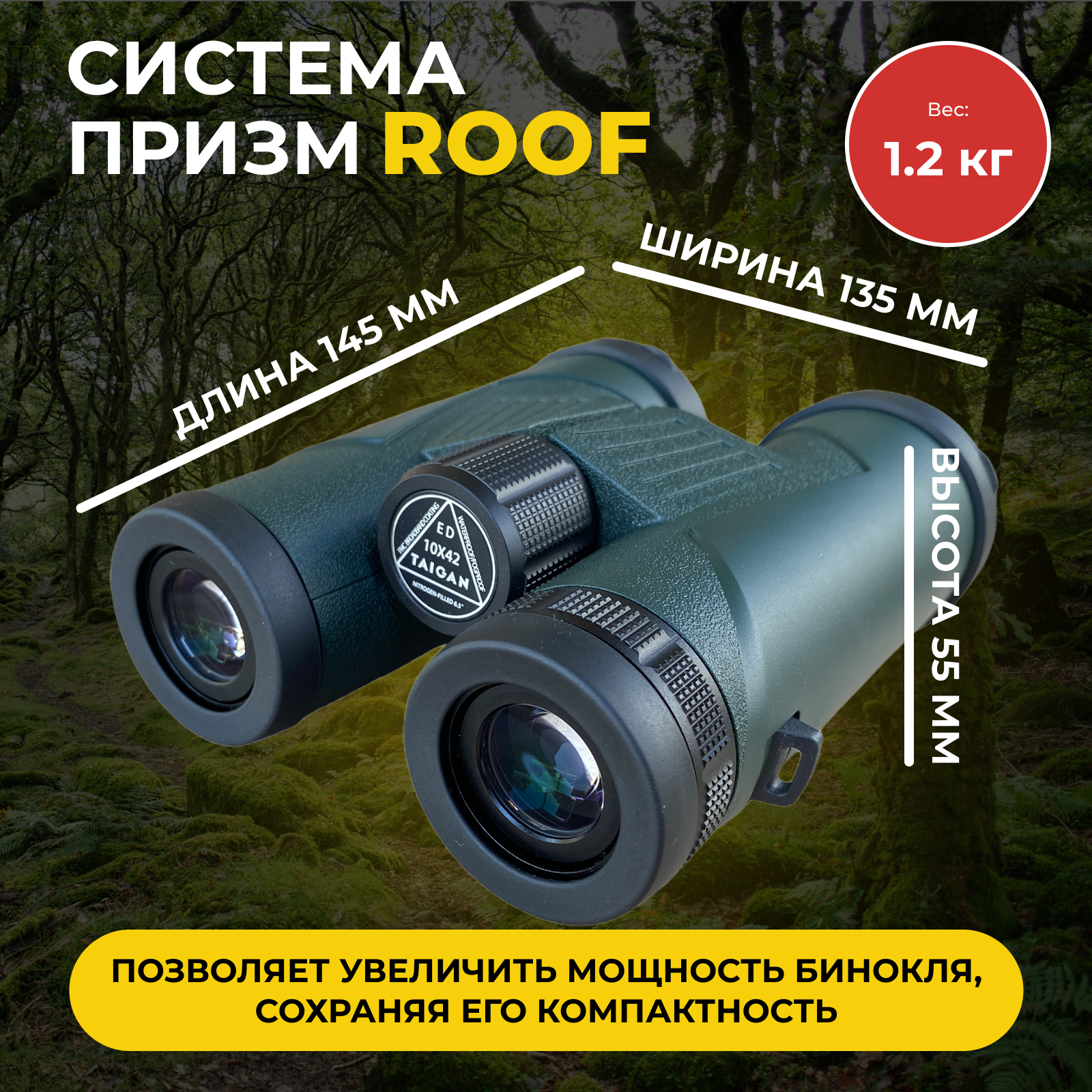 Бинокль Taigan 10X42 дает возможность наблюдения в сумерках и подходит для использования в темное время суток во время охоты. Кроме высокой яркости и четкости изображения, он также имеет влагостойкость благодаря заполнению азотом, что позволяет использовать его в любую погоду и обеспечивает защиту от запотевания.