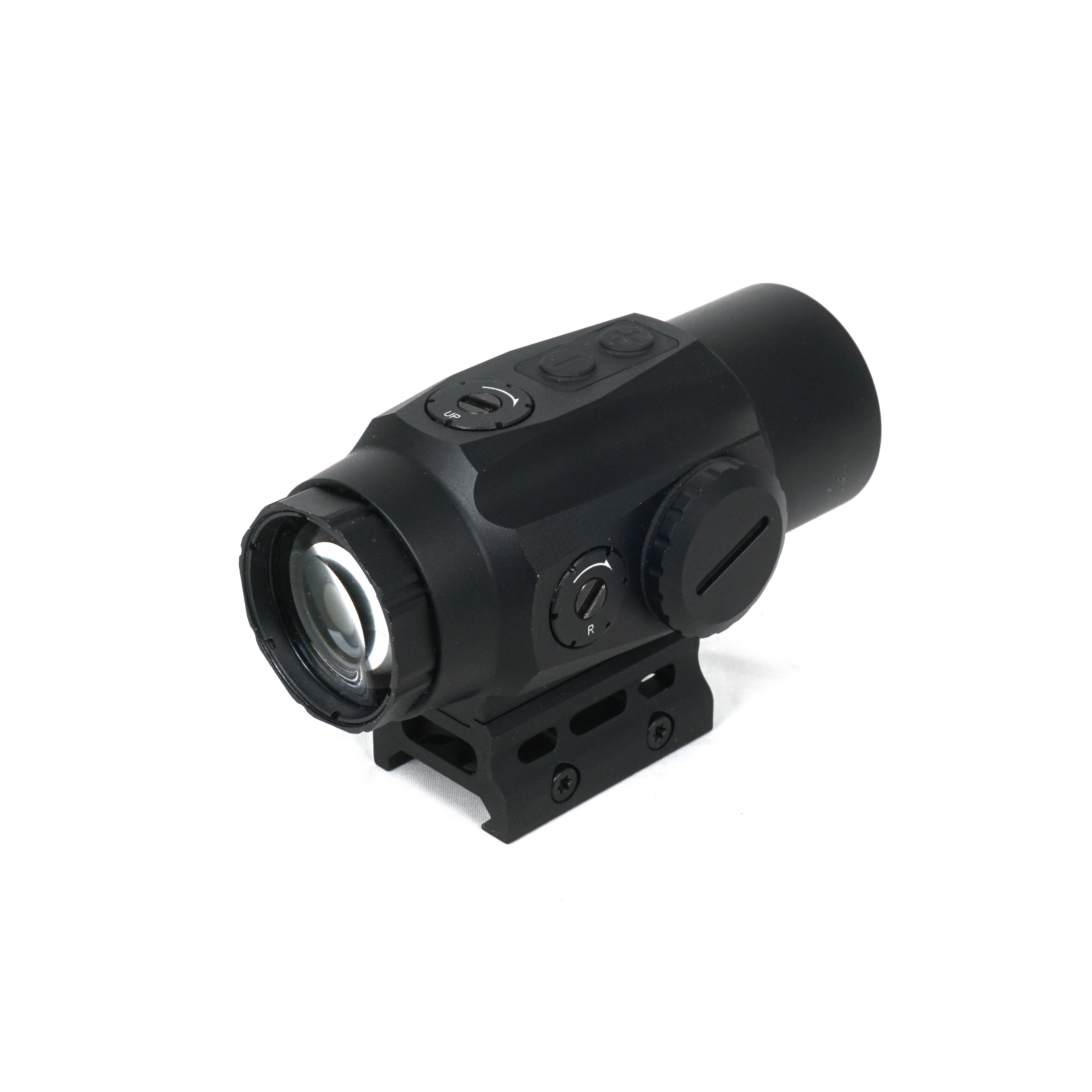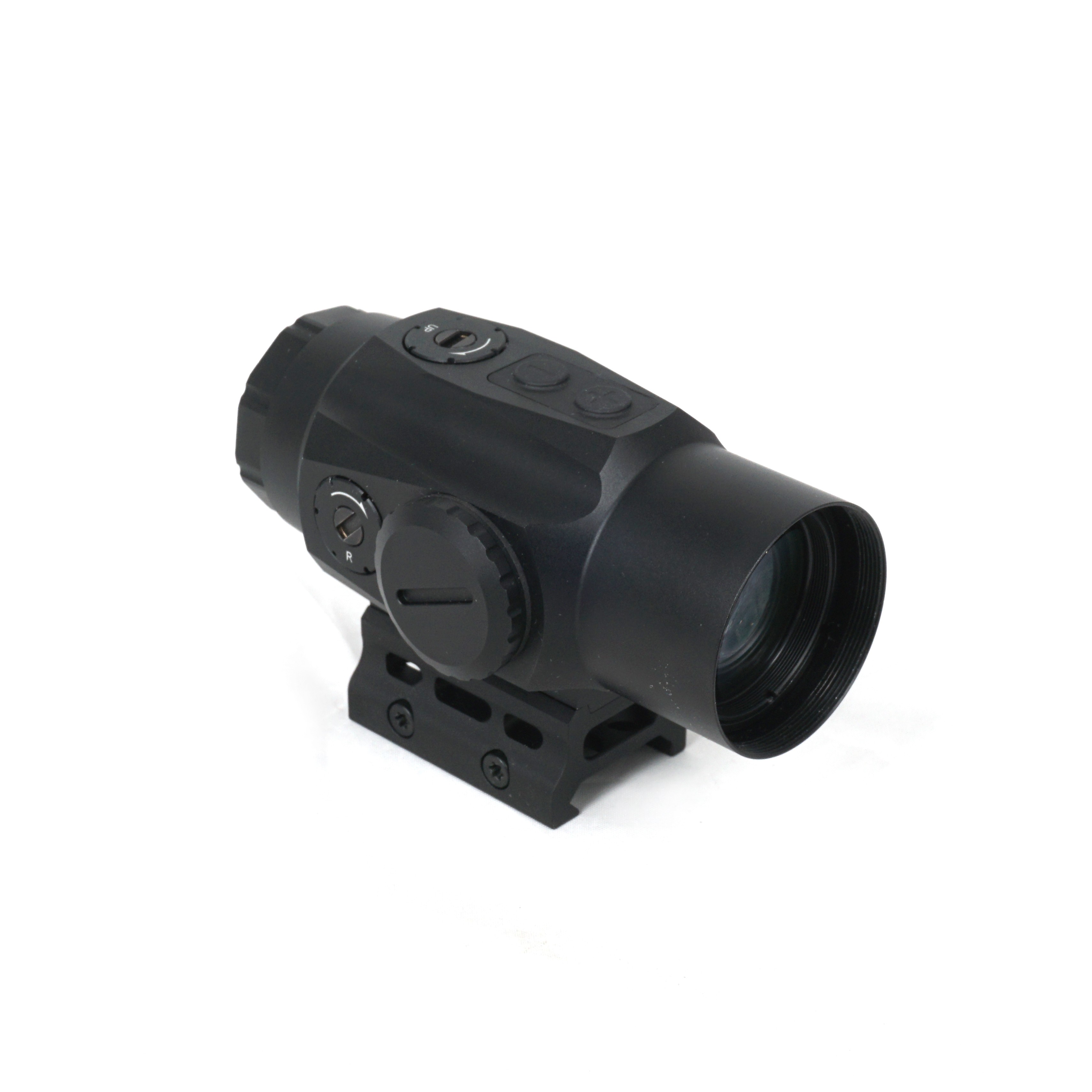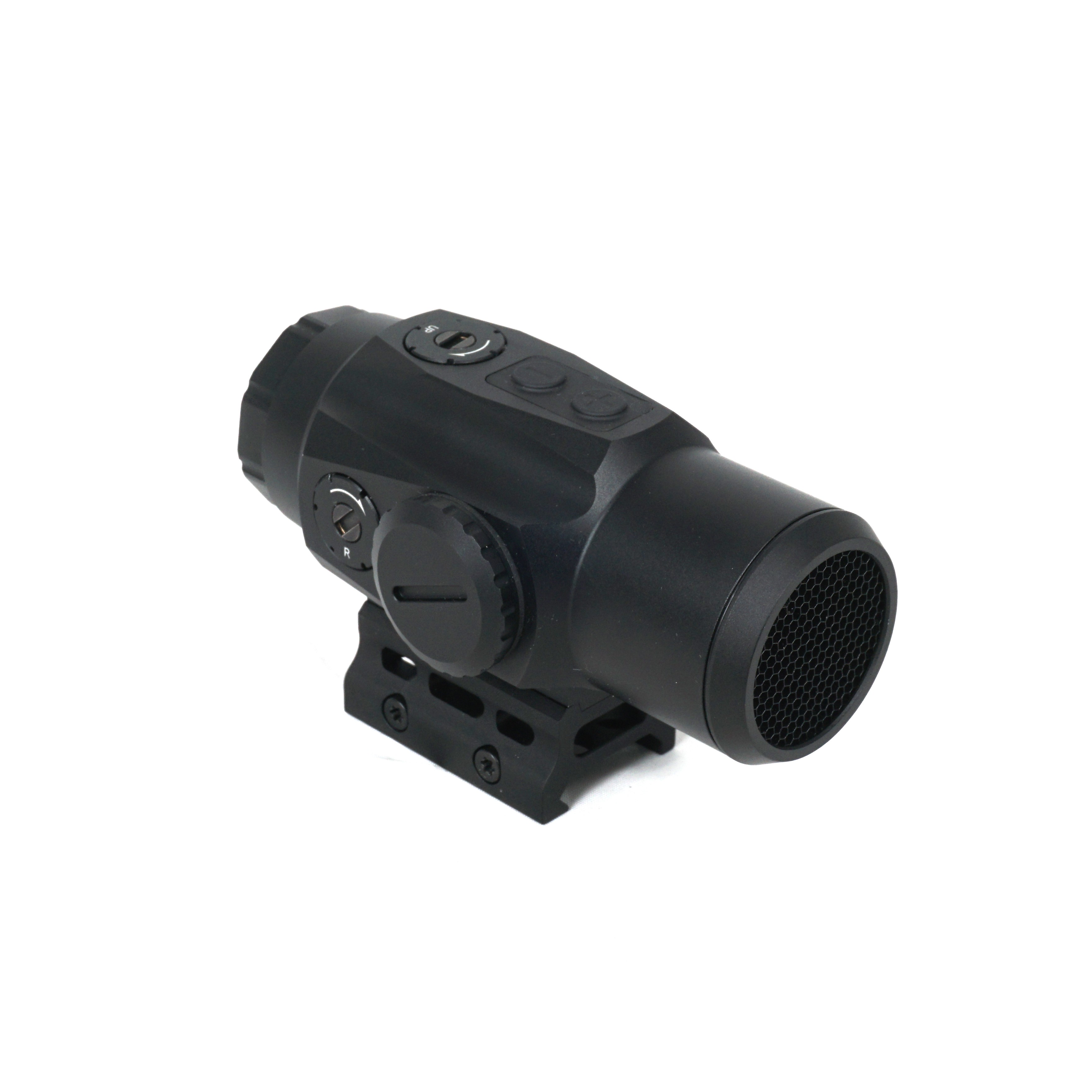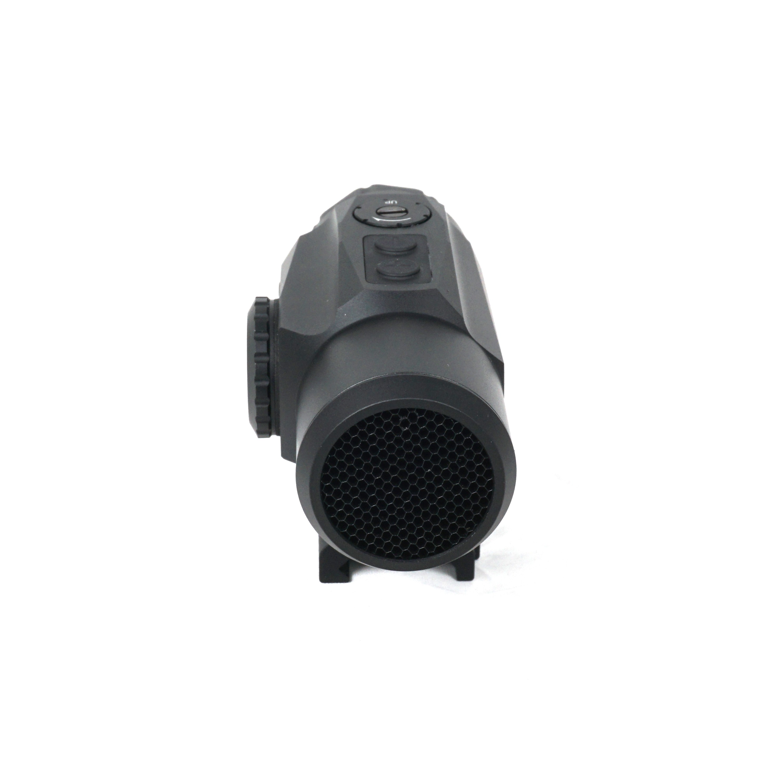 Регулировка яркости в пределах 10 уровней позволяет адаптировать видимость прицельной марки к различным условиям освещения. Восемь самых ярких режимов предназначены для использования коллиматора днем, тогда как два тусклых режима предусмотрены для совместной работы устройства с приборами ночного видения (ПНВ). Настройка интенсивности свечения выполняется с помощью кнопочного блока управления с прорезиненными выпуклыми кнопками.