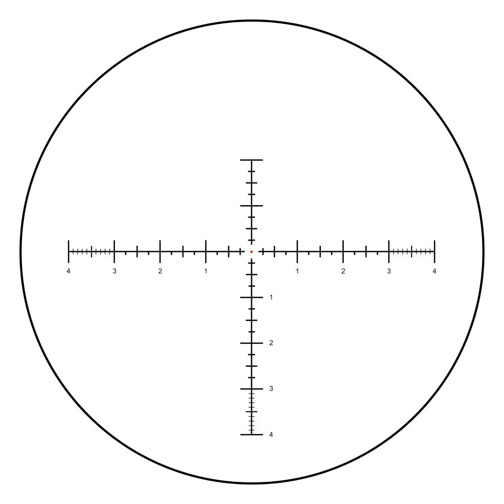 ) и при смене кратности визуально не меняется (не масштабируется), а баллистические метки работают корректно на 40x. Разработана по принципу MilDot, но с адаптацией под систему MOA: тонкие линии толщиной 0,01 MOA, разметка направляющих с шагом 0,125 и 1 MOA, в центре — «плавающая» точка диаметром 0,1 MOA. Позволяет с высокой точностью оценивать дистанцию до мишени и вносить поправки, соответствующие реальным условиям стрельбы.