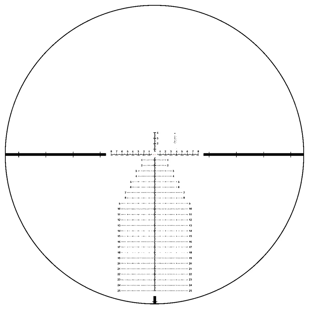 Прицельная сетка VEC-MBR выгравирована на стекле в первой фокальной плоскости, благодаря чему изменяет свой масштаб пропорционально кратности. Вертикальная и горизонтальная разметка позволяет оперативно вносить поправки при стрельбе выносом. Для тонкой подстройки под конкретные условия освещения предусмотрено 6 режимов яркости подсветки центральной марки.