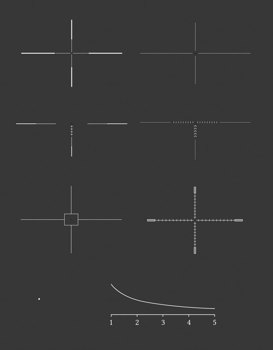 В прицеле предусмотрено семь стилей и четыре цвета (чёрный, белый, зелёный и красный) прицельной сетки. Внешний вид и цвет сетки настраивается в зависимости от предпочтений стрелка и условий наблюдения. Кроме того, отдельно к прицельной сетке можно включить дальномерную шкалу.