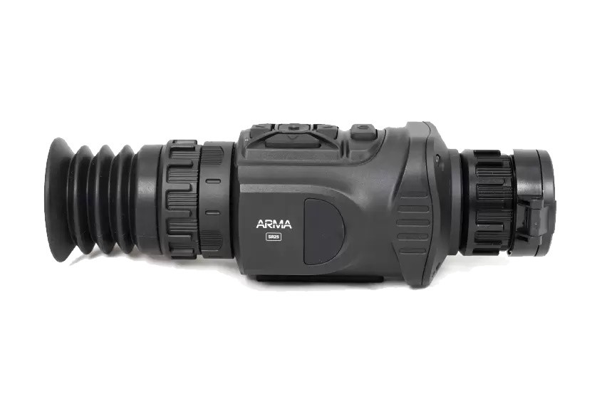 Оптический модуль Arkon Arma SR25 построен на длиннофокусном германиевом объективе 25мм/F1.0, имеющем показатель базовой кратности 3,1х. Для масштабирования изображения имеется цифровая функция Digital zoom, доступная в пределах от 1х до 4х. Благодаря этому максимальное увеличение составит 12,4х. Угол пространственного поля зрения FOV (Field of view) на минимальной кратности равен 7.0°×5.4°. В линейных размерах стрелок будет видеть перед собой область пространства размером 12,2 на 9,4 метра на удалении 100 метров. Фокусировка на дистанцию выполняется вручную, поворотом низкопрофильного кольца на объективе.