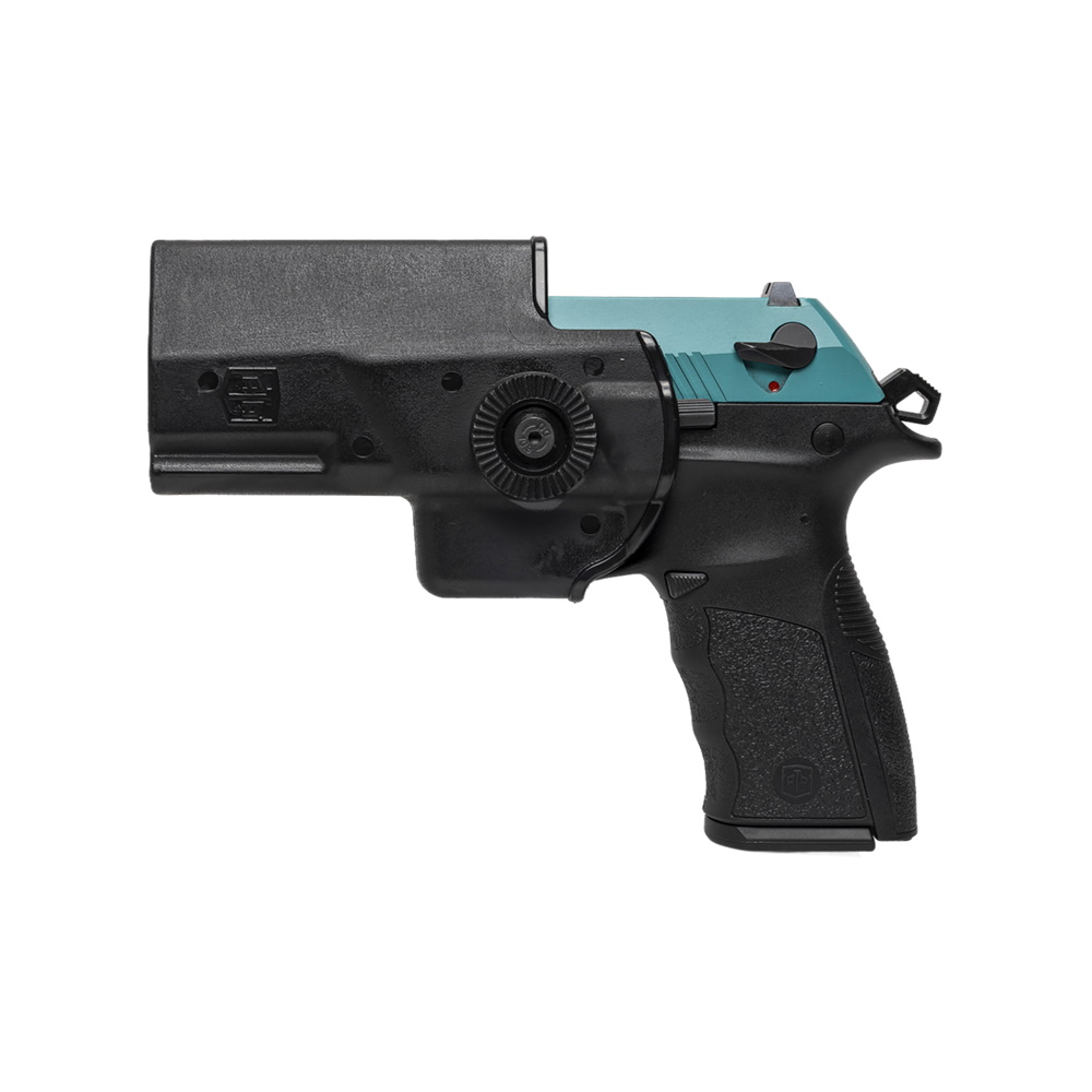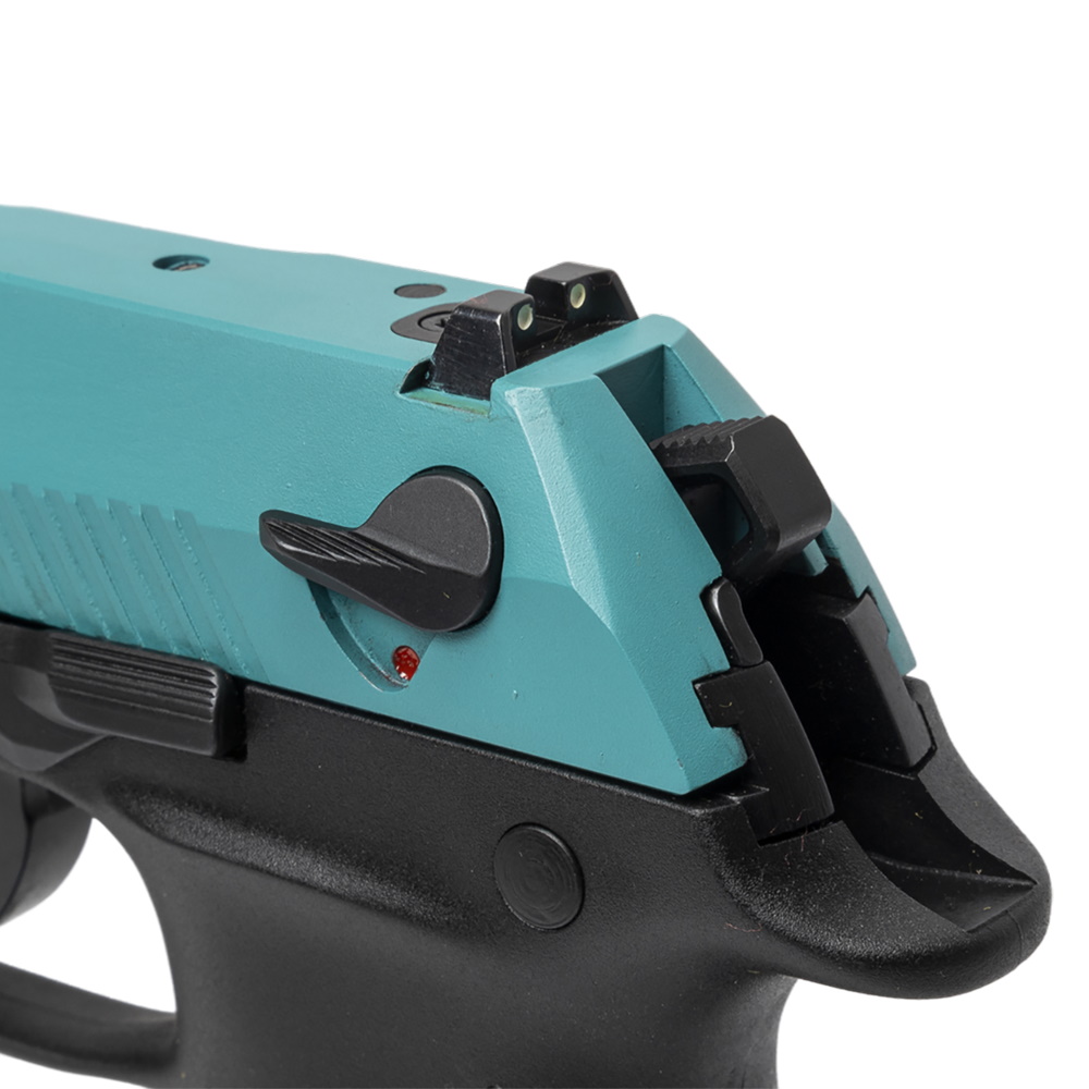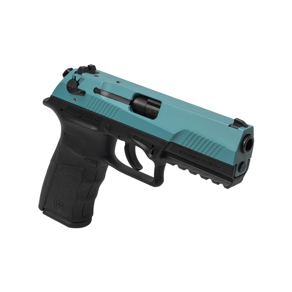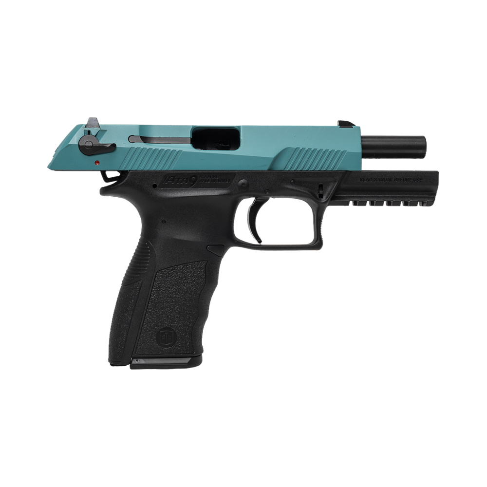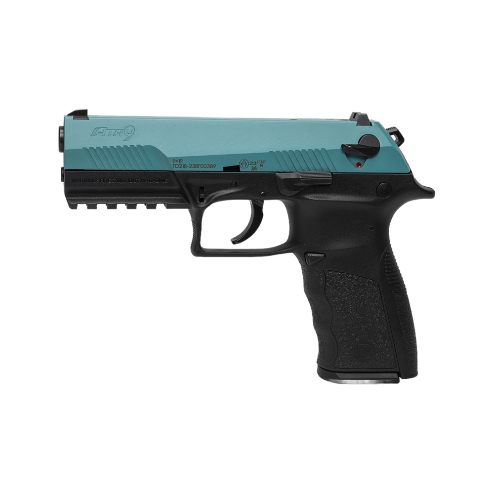 Спортивный пистолет-полуавтомат от турецкого бренда ATA Arms для отработки стрельбы. Затворная рама в данном исполнении оружия выполнена в голубом цвете по технологии AISI/SAE 4340, рамка из полимера - в черном.