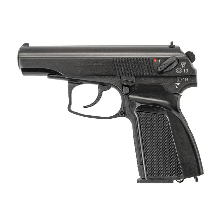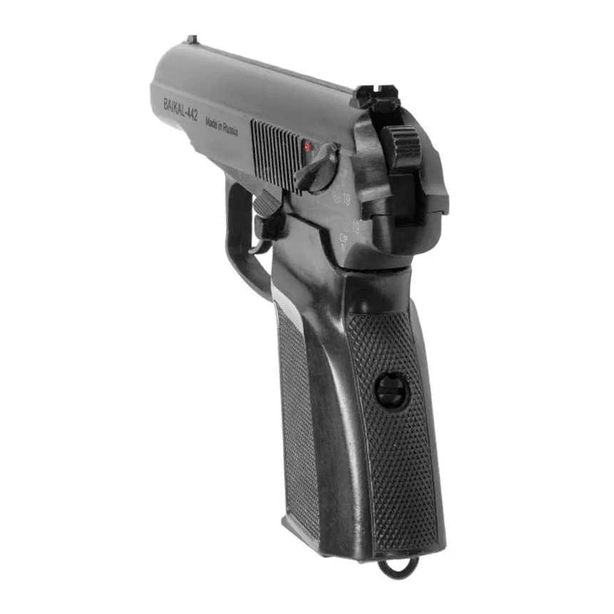 Пистолет Байкал-442-187 разработан на базе пистолета Макарова (ПМ). Это модель калибра 9х18 мм, предназначенная для обучения стрельбе и занятий стрелковыми видами спорта. Ударно-спусковой механизм - двойного действияУСМ ДД - может использоваться двояко:при нажатии на спусковой крючок происходит только спуск предварительно взведённого механизма или при нажатии на спусковой крючок происходит сначала взвод курка (ударника), а затем спуск.Подробнее , с открытым курком; при израсходовании всех боеприпасов срабатывает затворная задержка. Защелка магазина предлагаемого варианта - кнопочная, расположена у спусковой скобы слева.